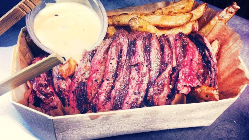 La formule type de la Brigade est une viande slicée accompagné de ses frites fraiches, courgettes ou salade et sa sauce au choix (poivre vert/lait de coco, échalottes confites, Roquefort/miel...) . La viande est de première qualité, fournie par Bif©, elle fond dans la bouche mais ne vide pas notre porte-monnaie. Comptez 10€ pour la formule ! On vous recommande l'Aloyau de bœuf slicé (provenance UE). Quant aux sauces et desserts (tartelette chocolat noix, tiramisu du moment...), ils sont faits maison et préparés tous les jours avec des produits frais servis dans des boites biodégradables ! La carte est évolutive et créative, en fonction des saisons.