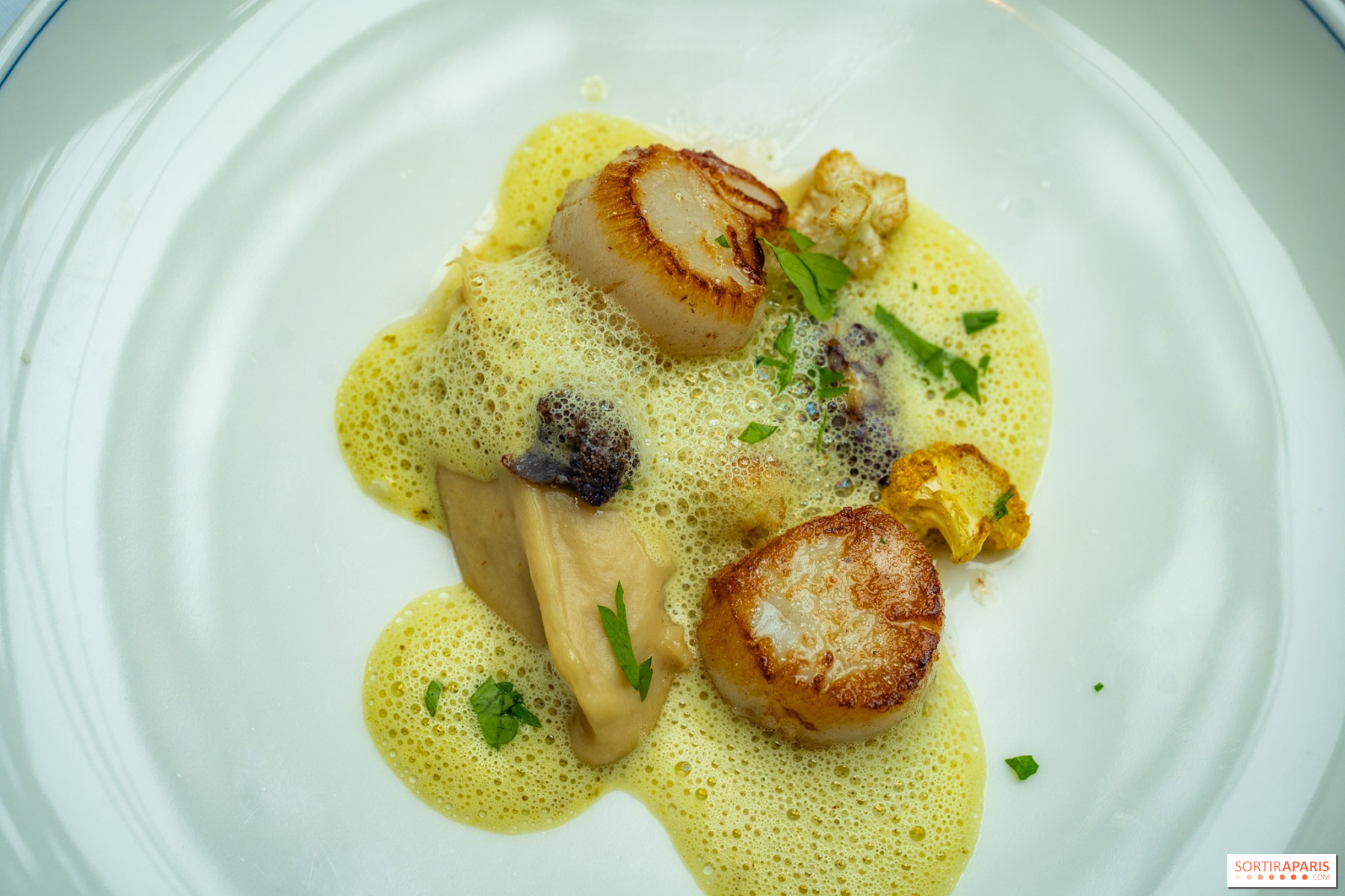 Le plat de noix de Saint-Jacques au Noilly Prat arrive ensuite avec sa purée de persil tubéreux et son chou-fleur multicolore en version meunière. Les cuissons sont justes, c'est le minimum qu'on peut attendre à ce tarif, et la fraîcheur du produit est au rendez-vous. Le mariage avec le persil tubéreux fonctionne bien, cette note terreuse équilibre l'iode sans écraser le produit principal. On aurait peut-être apprécié un peu plus de caractère dans l'assaisonnement, mais l'ensemble reste cohérent et respecte les saveurs de saison.