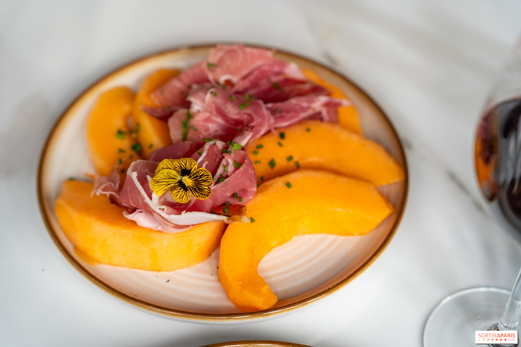 Látogatásunk alkalmával egy pelyhescsiga cassolette-tel és pácolt sonkás Charentes-i dinnyével kezdtünk, egy friss, bőségesen felszolgált előétel.
