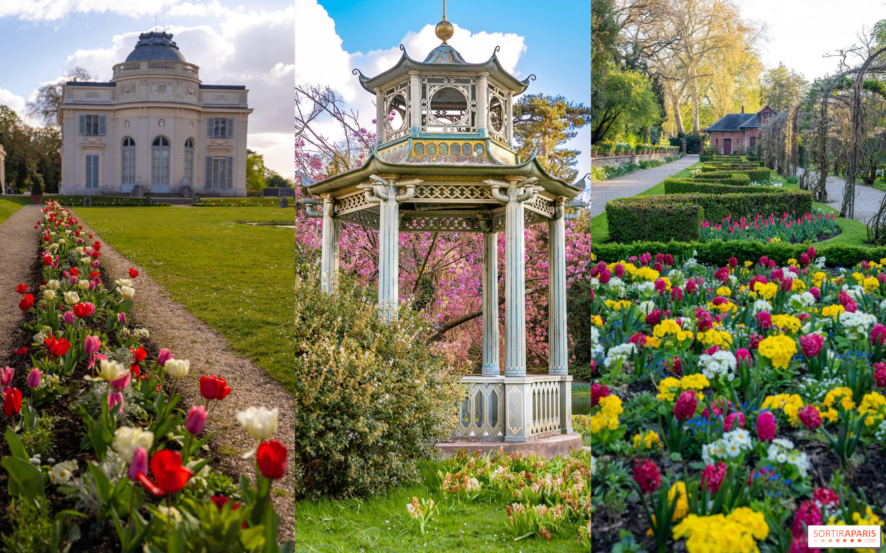Mungkin pada musim semi inilah taman Bagatelle memperlihatkan pesonanya yang paling menawan. Pohon sakura menampilkan kelopak berwarna merah muda dan putih di sepanjang beberapa jalan setapak, menciptakan suasana yang mengingatkan Hanami Jepang yang paling indah tanpa harus meninggalkan Paris. Di sekelilingnya, daffodil dan narcis menghias lereng-lereng dengan nuansa kuning pucat, sementara tulip-tulip pertama mulai menyembul di dalam bedengan. Semuanya membentuk panorama yang hampir setiap hari berubah, membuat layak untuk kembali lagi satu, dua, atau bahkan lebih banyak kali.