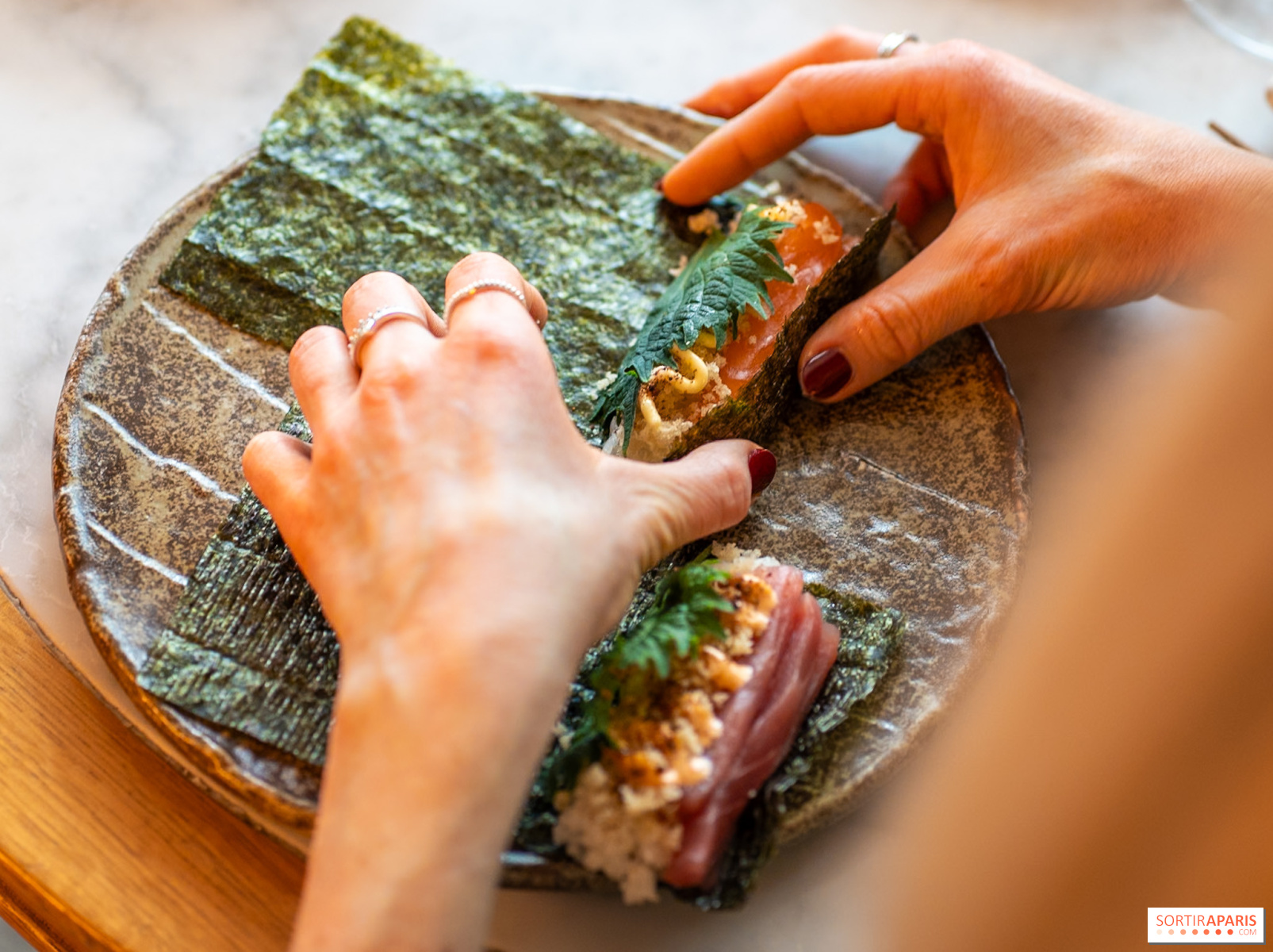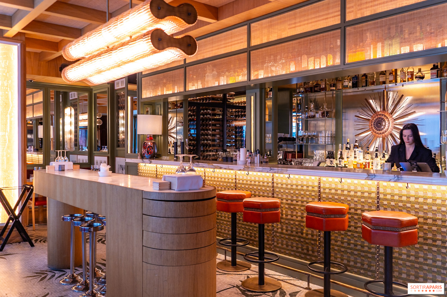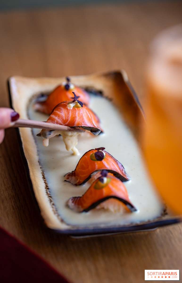 Appena si varca la soglia, l’atmosfera glamour si fa subito notare. L’arredo richiama un izakaya contemporaneo, quel bar giapponese dedicato al saké dove si condividono piccoli piatti e bevande in un ambiente conviviale. Qui, la convivialità si trasforma in un’esperienza più raffinata, perfetta per una cena tra amici o un’intima chiacchierata elegante. Il locale si inserisce tra quegli indirizzi parigini dove si sente subito un senso di accoglienza, tra modernità e dolcezza nipponica. Due sale separate accolgono i clienti: la prima spaziosa, affacciata sulla strada, illuminata e con un lungo bancone bar, e la seconda più riservata, ideale per serate in tono più soft e con luci soffuse.