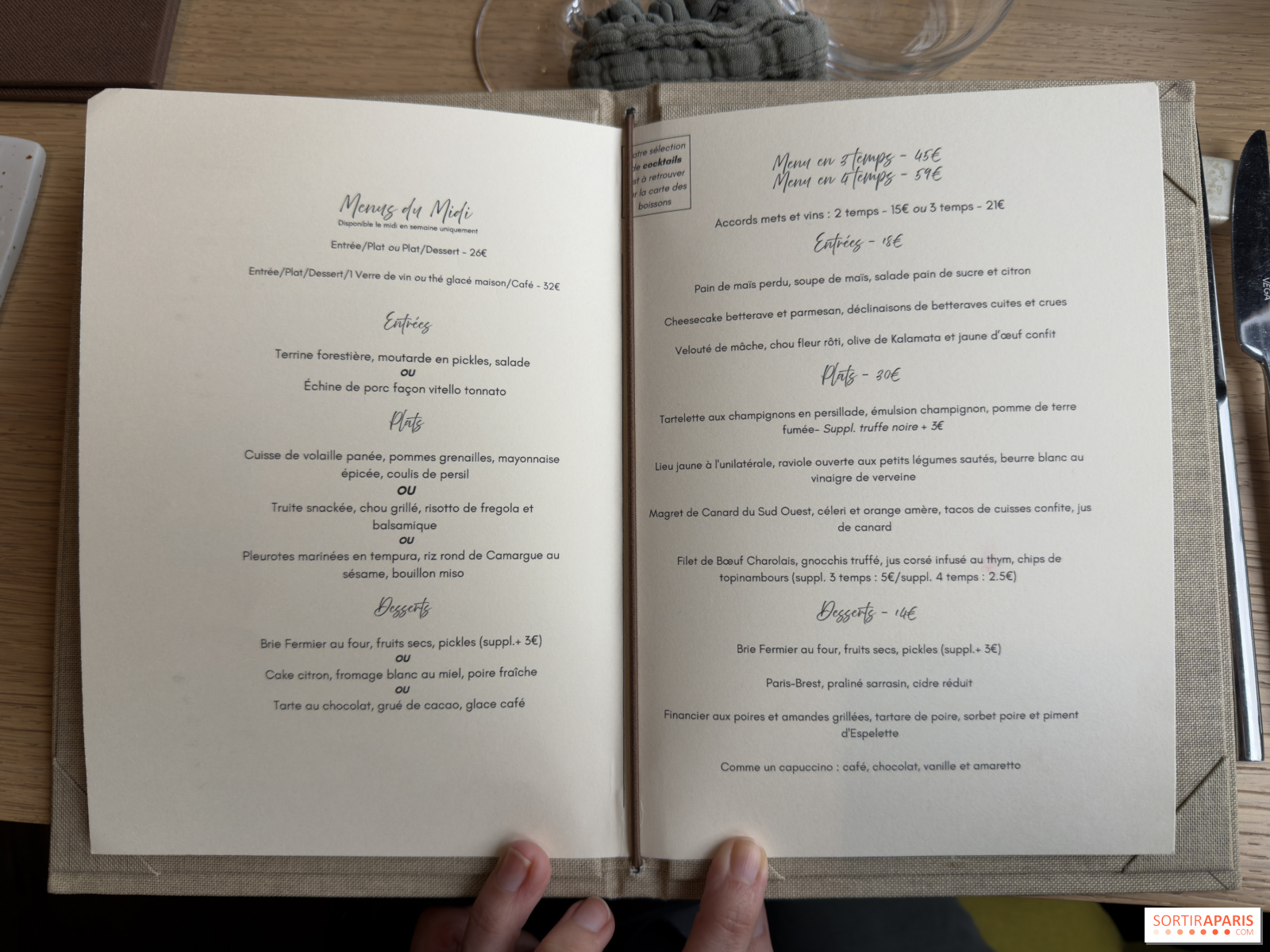 La carta propone due formule a seconda del momento della giornata. Un menu pranzo in settimana a 26 € (antipasto/piatto o piatto/dessert) oppure 32 € per la versione completa, con un bicchiere di vino, tè freddo fatto in casa e caffè. Nei pranzi del weekend e nelle cene, il menu fisso si compone di 3 portate a 45 € o 4 portate a 59 €, con abbinamenti di vino e piatti a partire da 15 €. Se desiderate scoprire il ristorante senza spendere troppo, il menu pranzo in settimana è davvero un'ottima occasione.