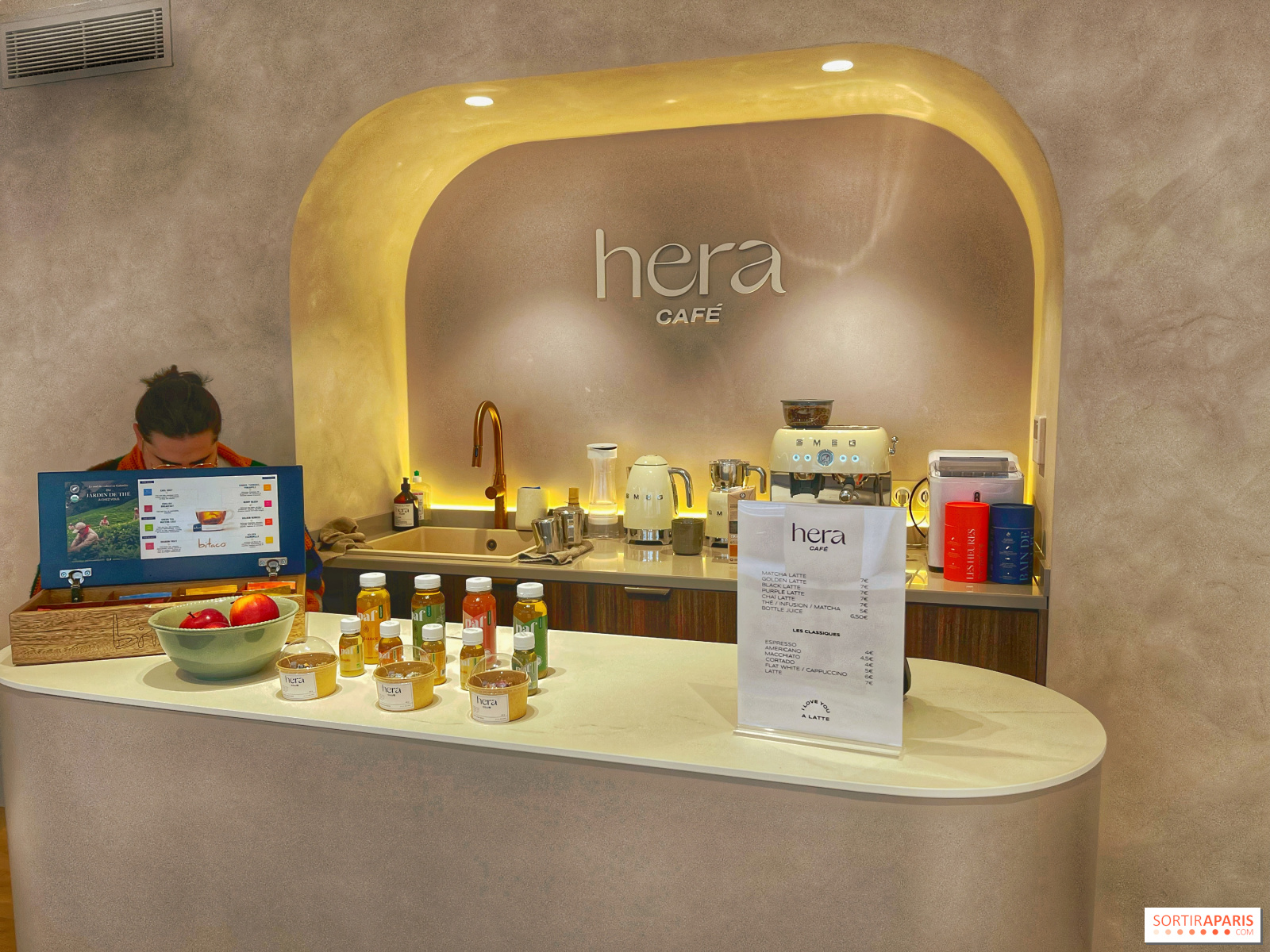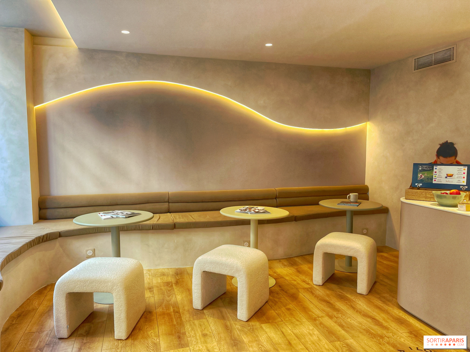 スポーツ教室の後は、更衣室と同じようにミニマルで明るくデザイナーズな内装の小さなコーヒーショップで、ヘルシーなドリンクや甘いスイーツを楽しむことができる。さらに、スポーツをしなくても気軽に立ち寄ることができる!フィットネスウェアが足りない場合は、ショッピングエリアでカリフォルニアやパリのブランドを手に入れることもできる。