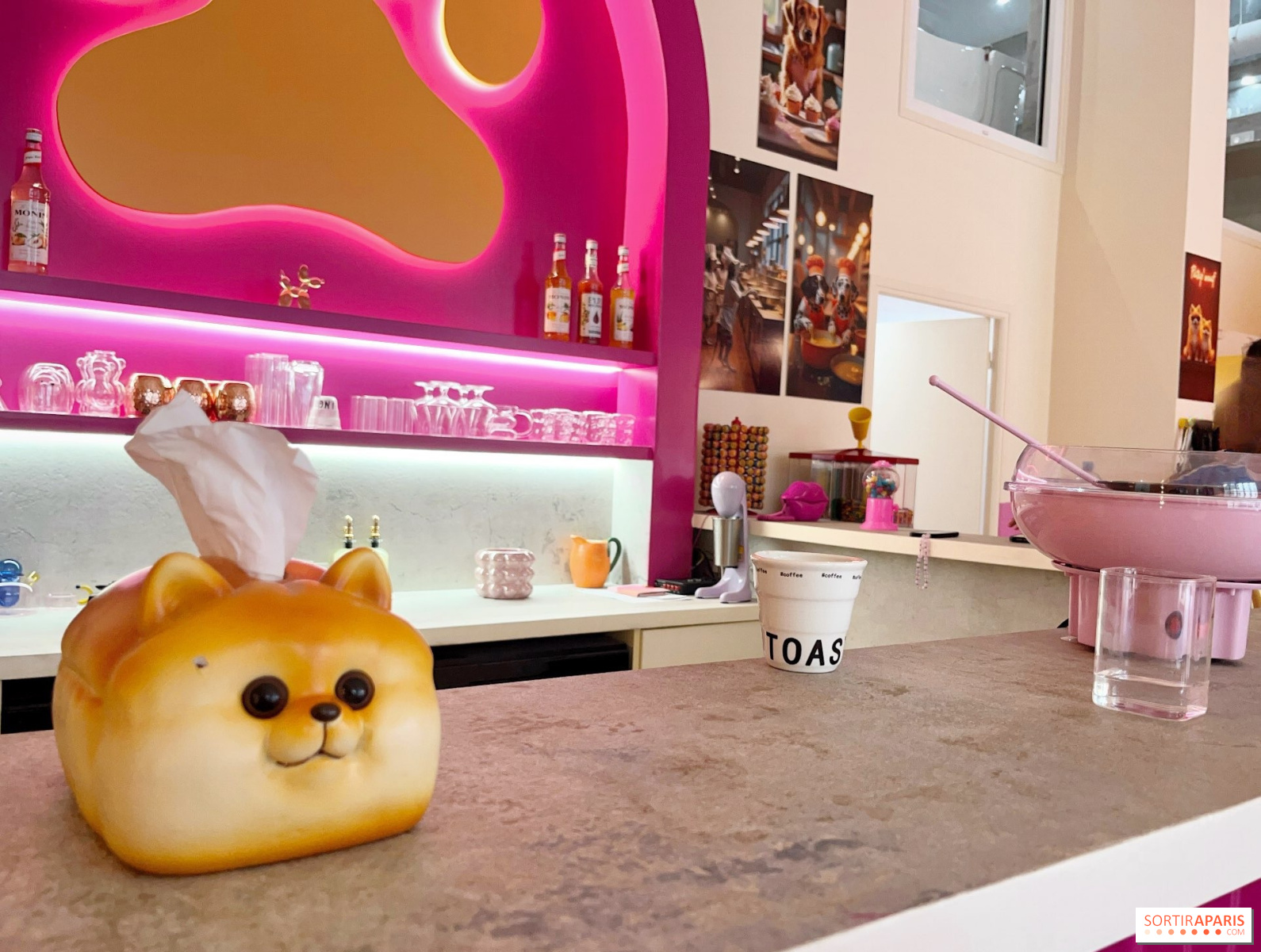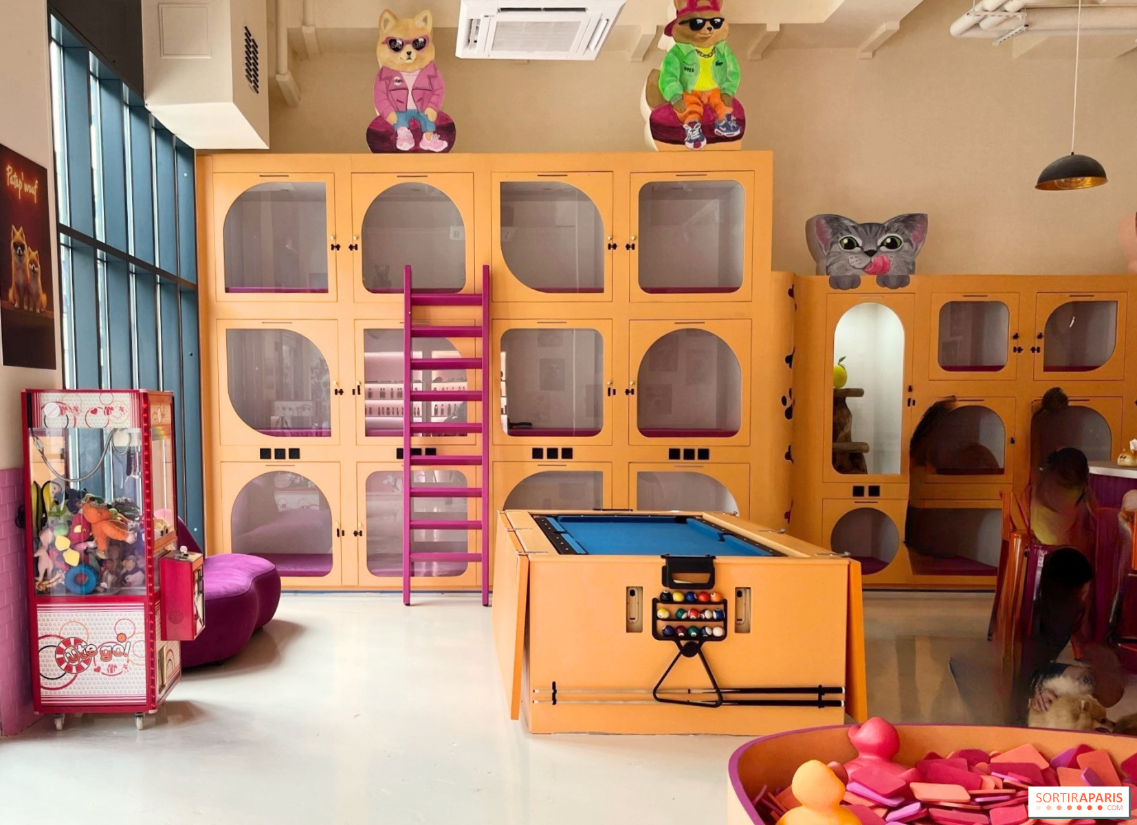 2階のグルーミング・サロンでグルーミングを受けたり、プレイ・エリアで他の毛玉と交流したり、バーで温かい飲み物を楽しんだりできる。日中は デイケアセンターに預けることもでき、定期的な散歩や週2回の 森への遠足もある。