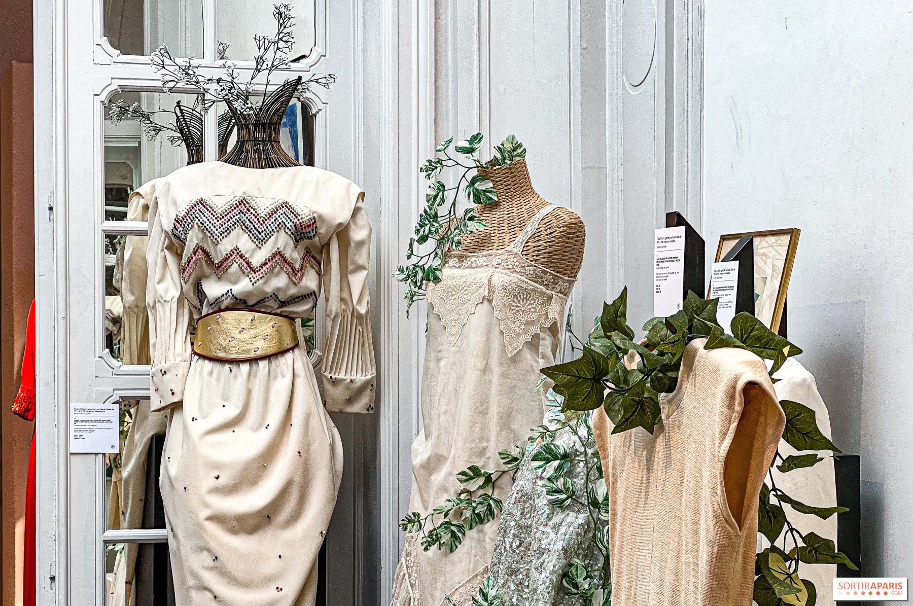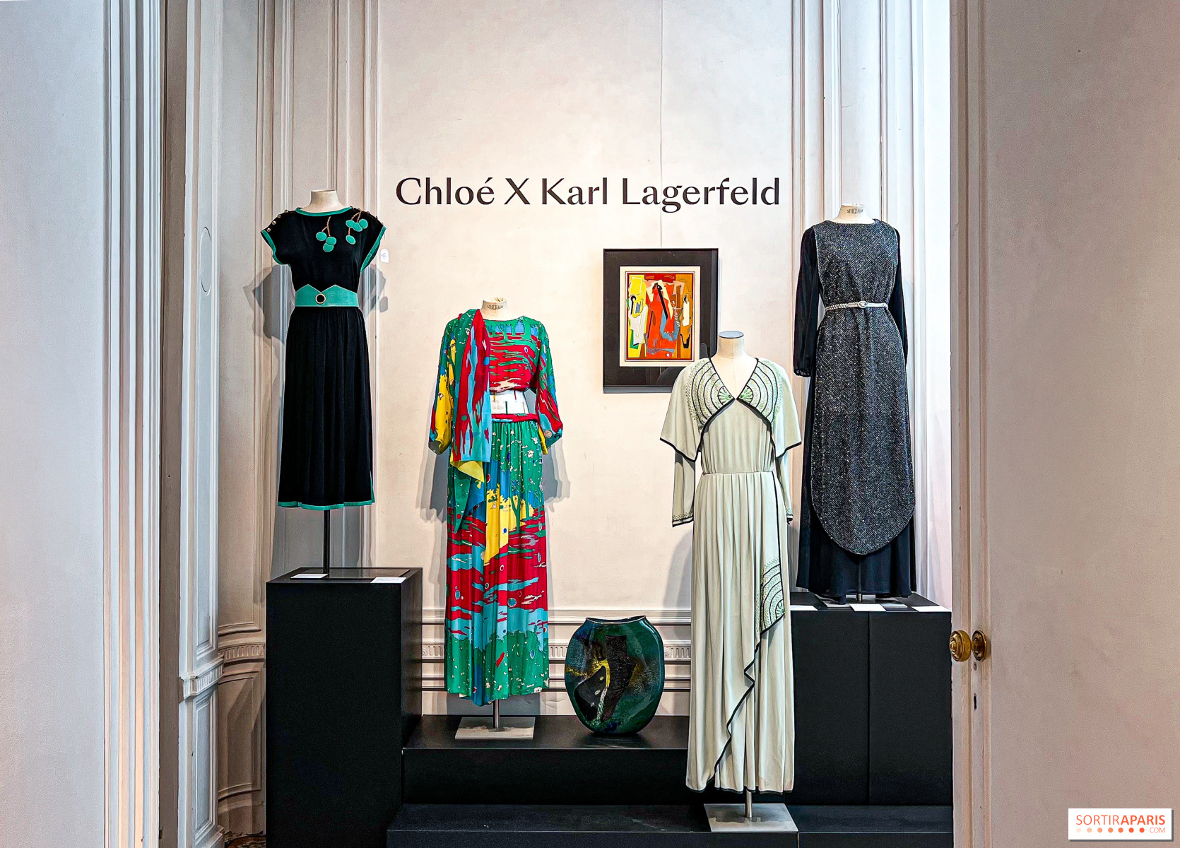 中心は、ラガーフェルドがシャネルに移る前にクロエのためにデザインした最後のコレクションとなった、1983年10月14日に発表された1984年春夏コレクションの刺繍入りアイボリーシルクのイブニングドレス。