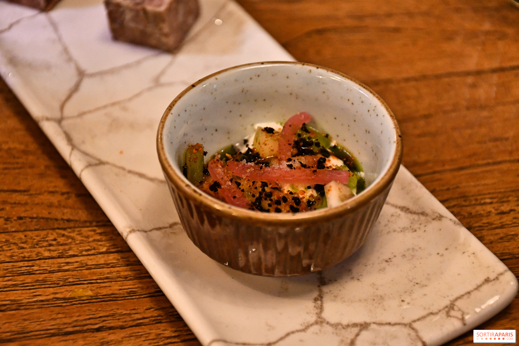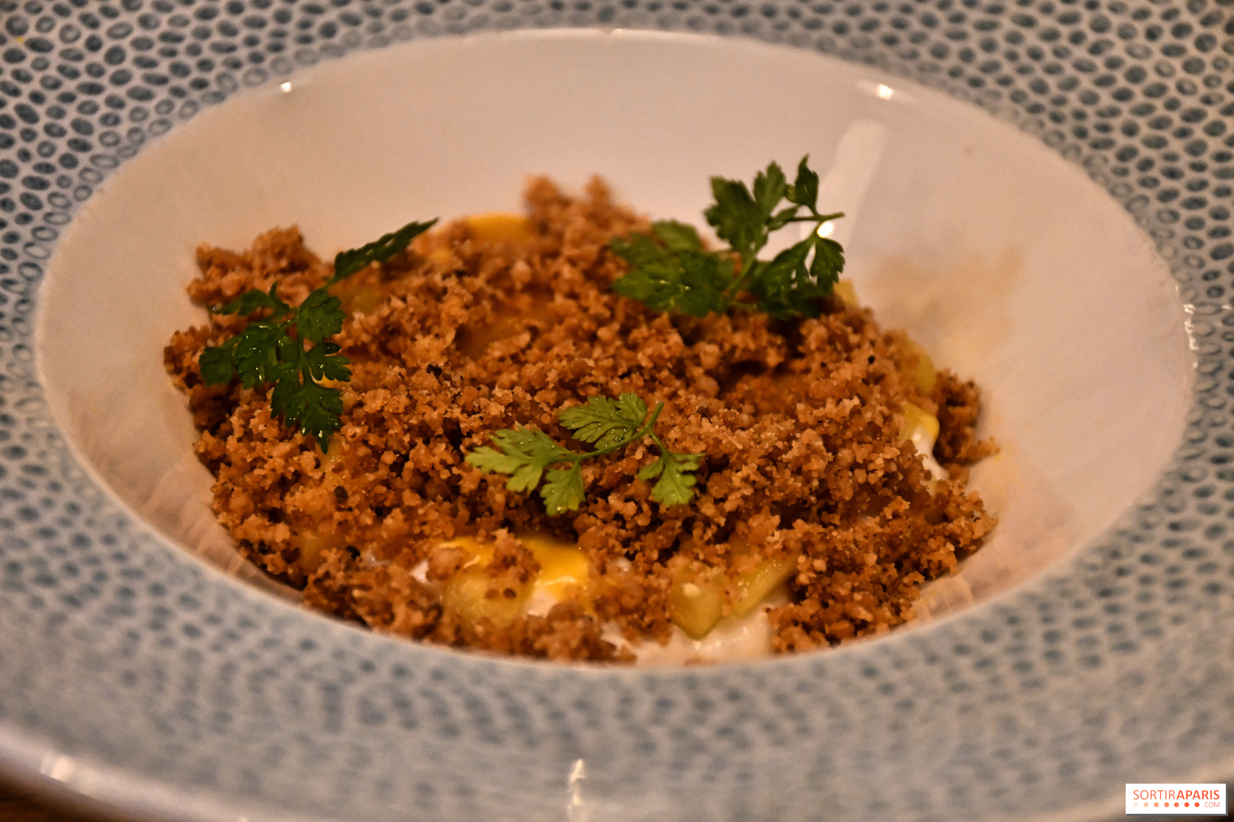 前菜はバラッタのミニチュア版で、平飼いトマト、つる桃、ポン酢ドレッシングが添えられている。甘さとしょっぱさの爽やかなミックスだが、この前菜をアラカルトで選ぶのをためらうなら、マノの料理を代表するものではない。特に、料理全体を覆っているかなり強力なケッパーパウダーを高く評価したい。このリスクを冒すことで、当たり外れがある。結果は賛否両論だが、私たちとしては非常に魅力的だ。