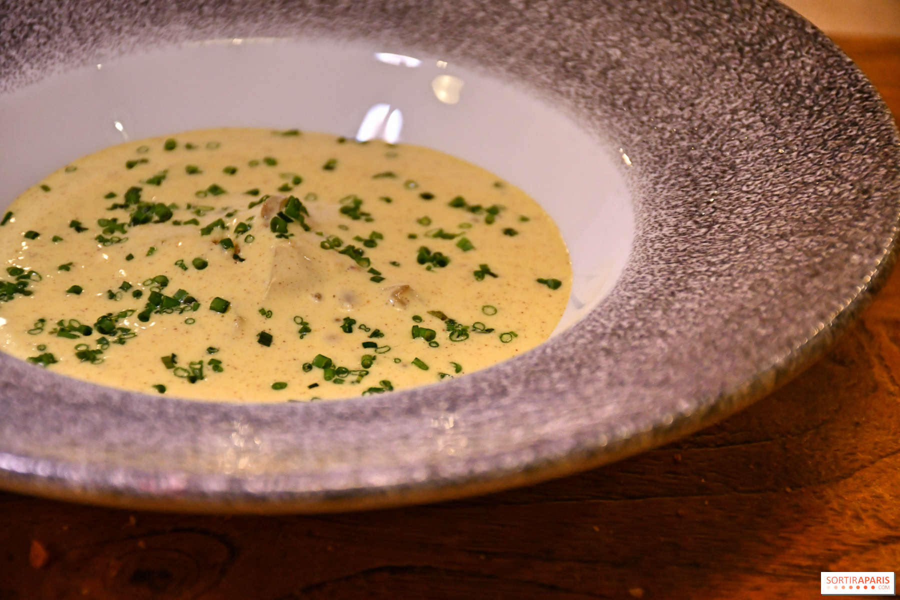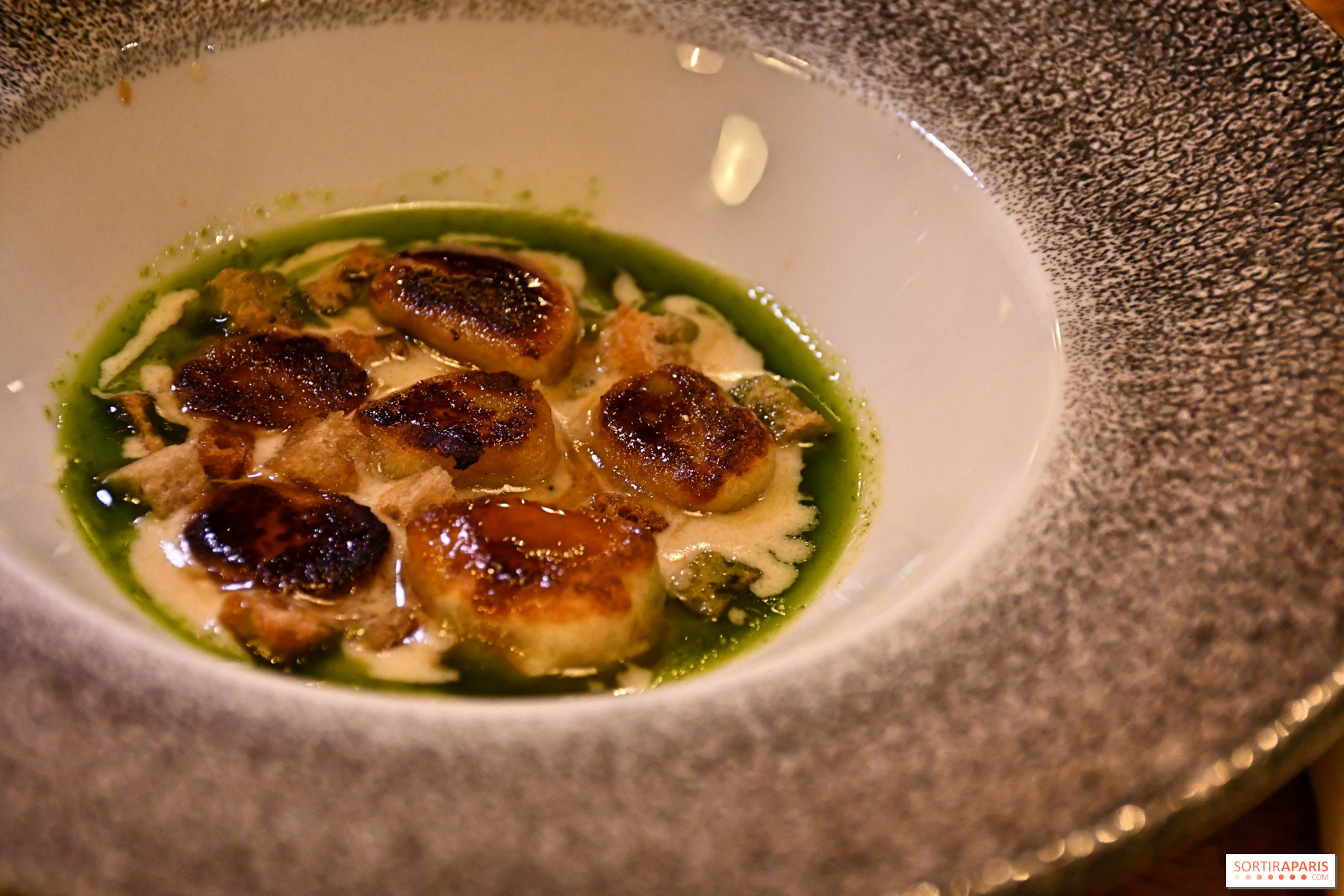その後、その日のパートナーと私たちでは、料理が微妙に異なっていた。ひとつは、ルイユのムースの中に ツブ貝が隠れている海洋風味のもので、これも古典をモダンにアレンジしたものだ。私たちはほとんど食べ終わるまでスキップする。もうひとつは、ニョッキ。もちろん自家製で、今回はとてもソフトな食感で、パルメザンチーズクリームと鶏肉のジュが添えられている。シンプルで効果的だ。
