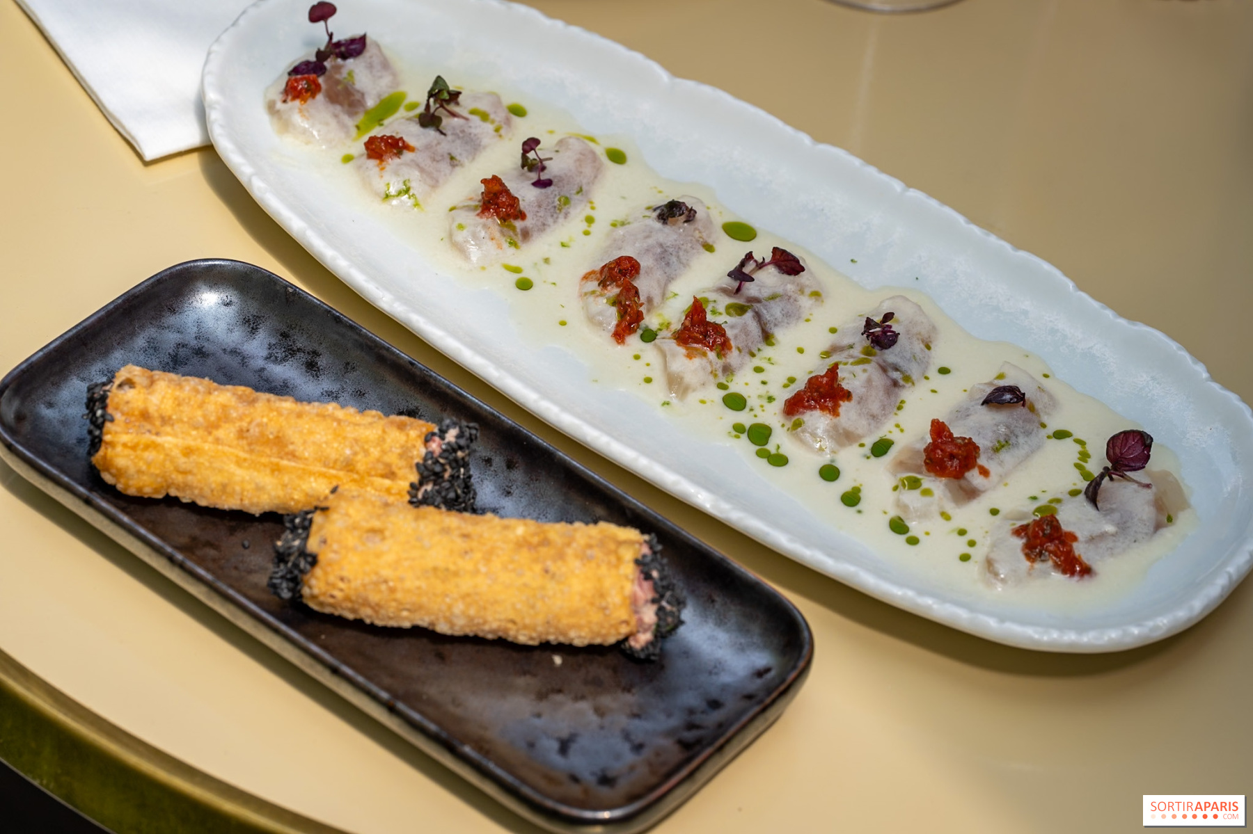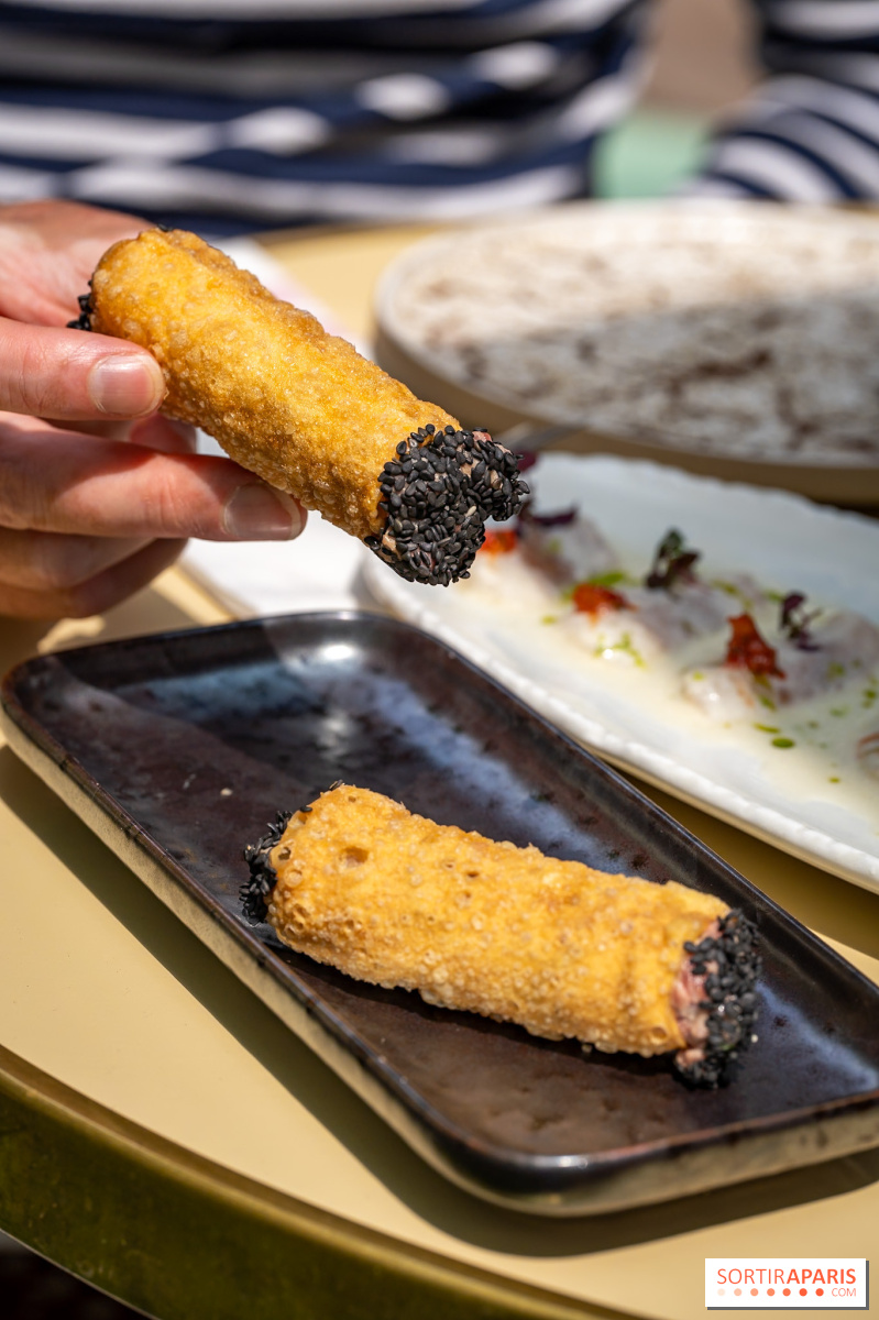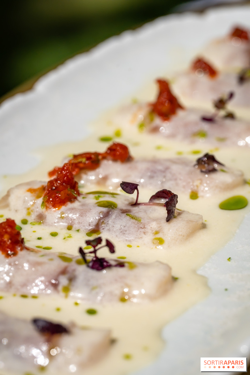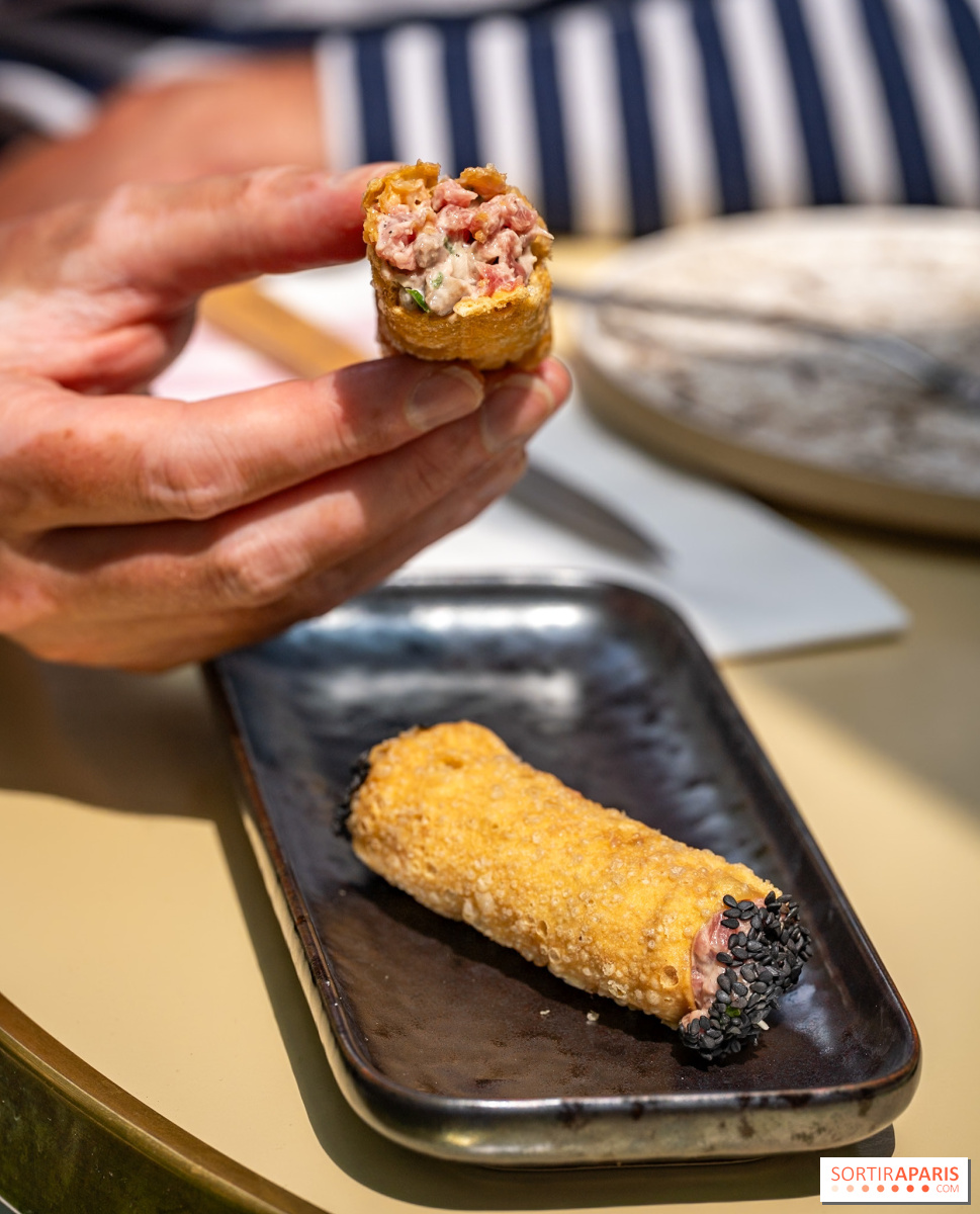前菜は夏らしい軽やかさで幕を開ける。 スズキのクルード、柚子、コンババレモン、ココナッツミルク添えは、活気と甘みのバランスに驚かされる。シイタケとワサビを添えた牛肉のタルタルカンノーロは、ハーブの香りがさわやかだ。
