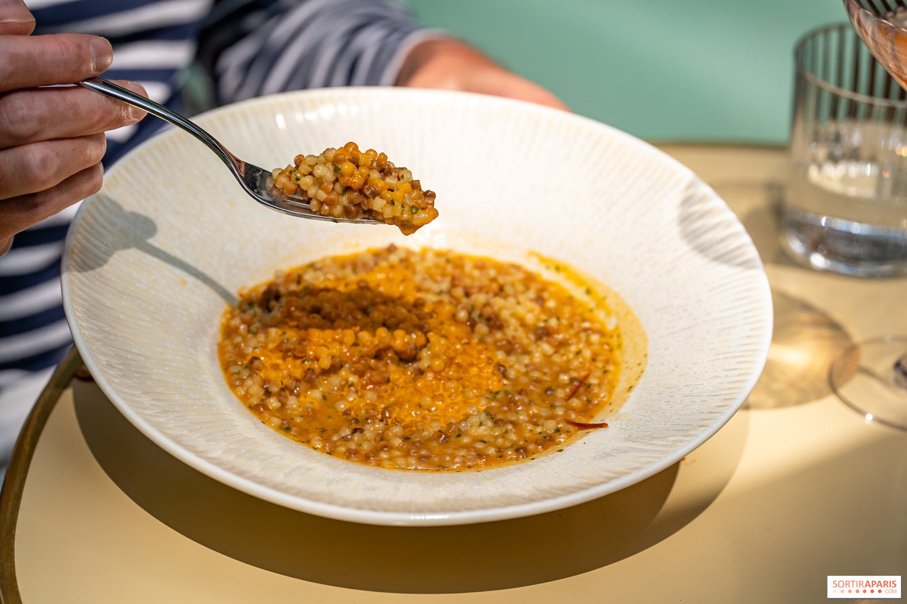メインディッシュは、ムール貝とアサリを添えたフレゴラ・サルダがスパイシーなンドゥーヤのエマルジョンで花開く。二度火を入れたタコは、歯ごたえを残したままフォークでとろける。茄子のキャビアと砂糖漬けのアーティチョークが添えられている。料理はよくできているが、もっと食欲をそそるきれいな皿が欲しかった。