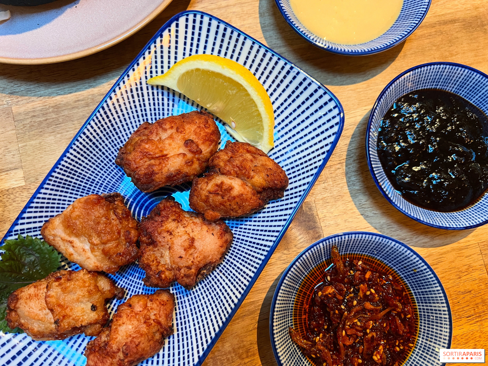 味噌、ニンニク、フライドオニオンを使ったちょっと辛いソース(タベル・ラーユ)、甘酸っぱいソース(ナンバン)、ハニーマスタードマヨネーズの3種類のソースにつけて食べるのが楽しい。