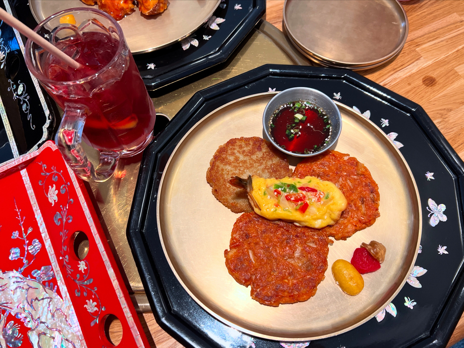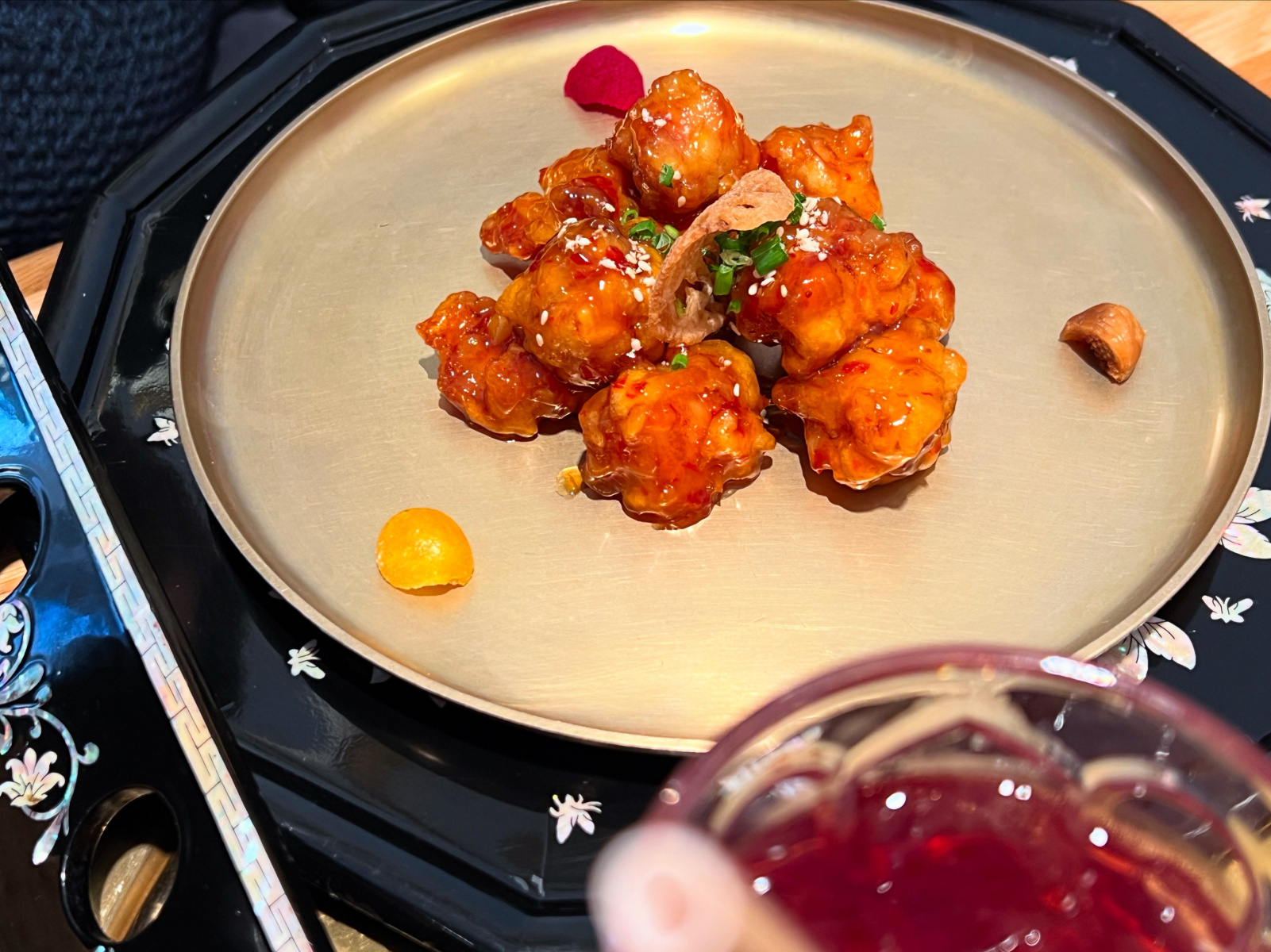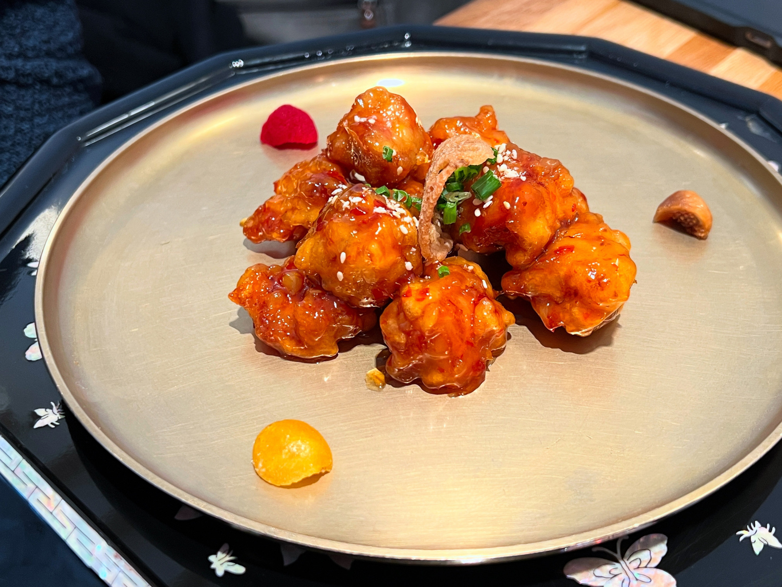 칠리 소스를 곁들인 매콤한 닭튀김 (16유로), 부드러운 요리, 야채와 볶은 새우를 곁들인 김치 케이크 (15유로) 등 한식의 풍성함이 시작부터 느껴집니다. 접시 가장자리의 설탕에 절인 과일과 같은 반찬과 디테일에 특히 신경을 썼어요.