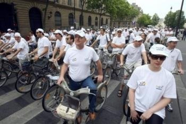 Les 365 "Vélibs'", portaient tous des T-shirts crées pour l'occasion afin de célébrer le premier anniversaire du réseau Vélib. Cette charmante petite délégation s'est élancée vers la Concorde, accompagnée de motards de la police et de voitures officielles du Tour de France.
