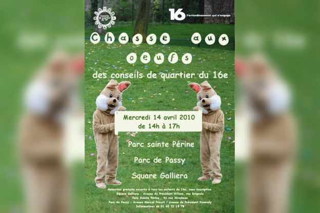 Les Conseils de Quartier du 16e arrondissement organisent la deuxième édition de la Chasse aux œufs mercredi 14 avril 2010 de 14h à 17h.
