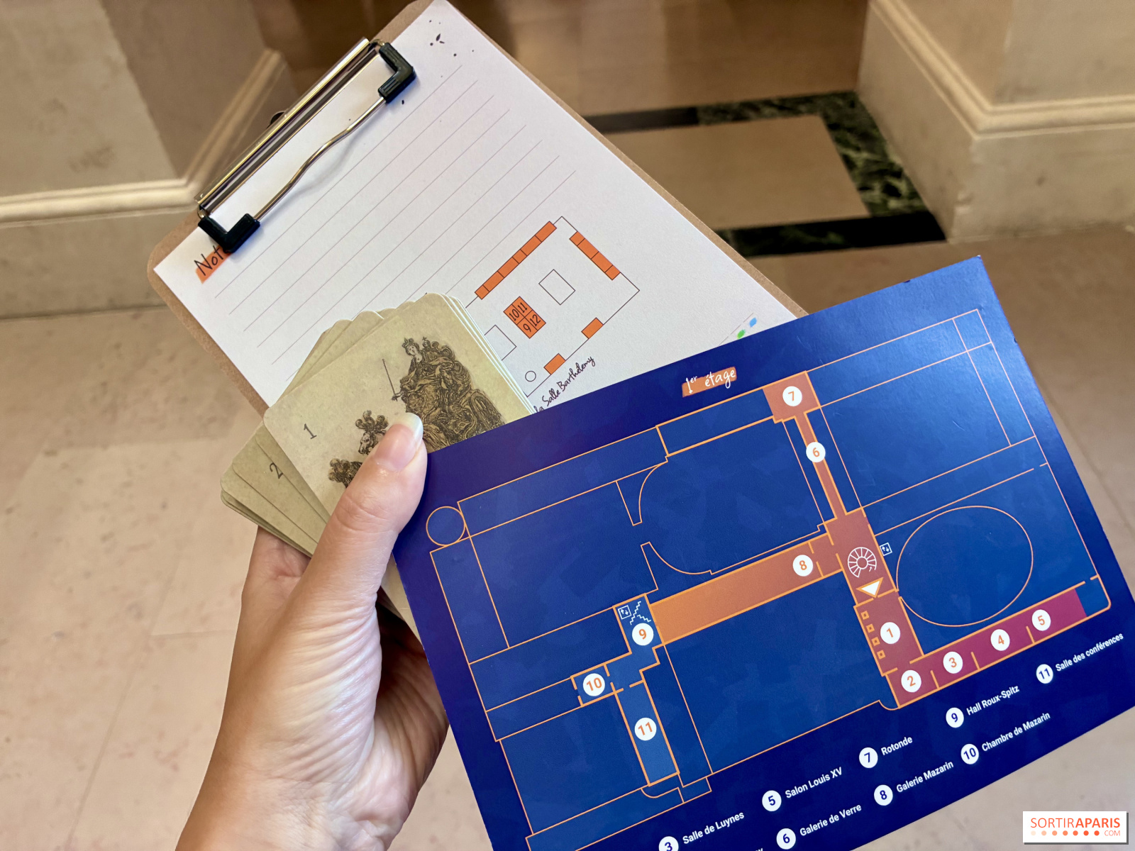 Dans notre besace, très pratique à transporter, on trouve une carte de la bibliothèque, un bloc-notes et un livret d'énigmes, entre autres. Au fil des énigmes, plutôt accessibles pour tous les publics pour peu que l'on soit un peu concentré, on arpente les différentes salles, on tente de se repérer efficacement pour récolter tous les éléments importants et les noter au fur et à mesure, tout en se cultivant sur Mazarin, afin de former une cote de livre.