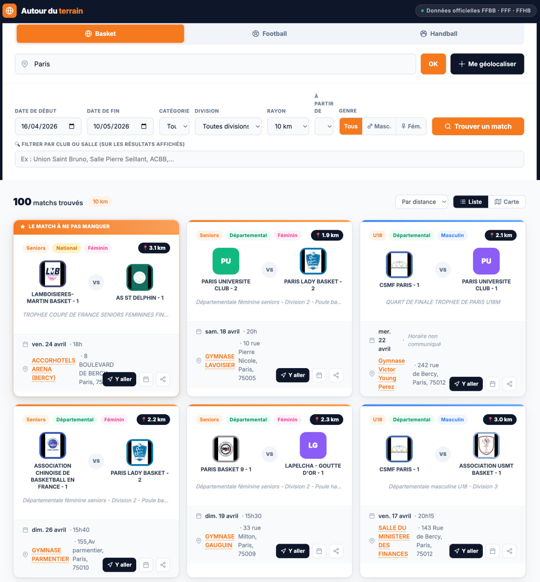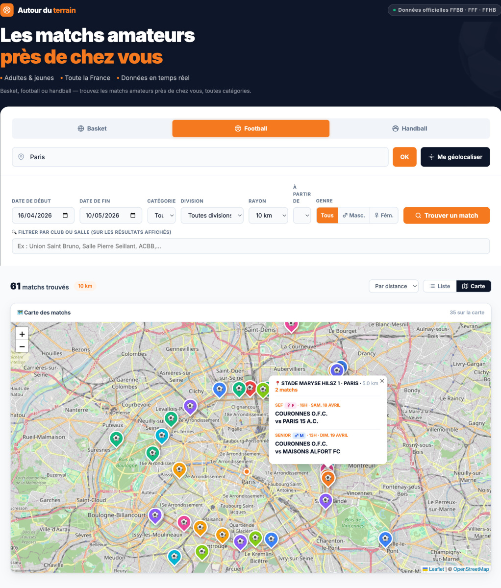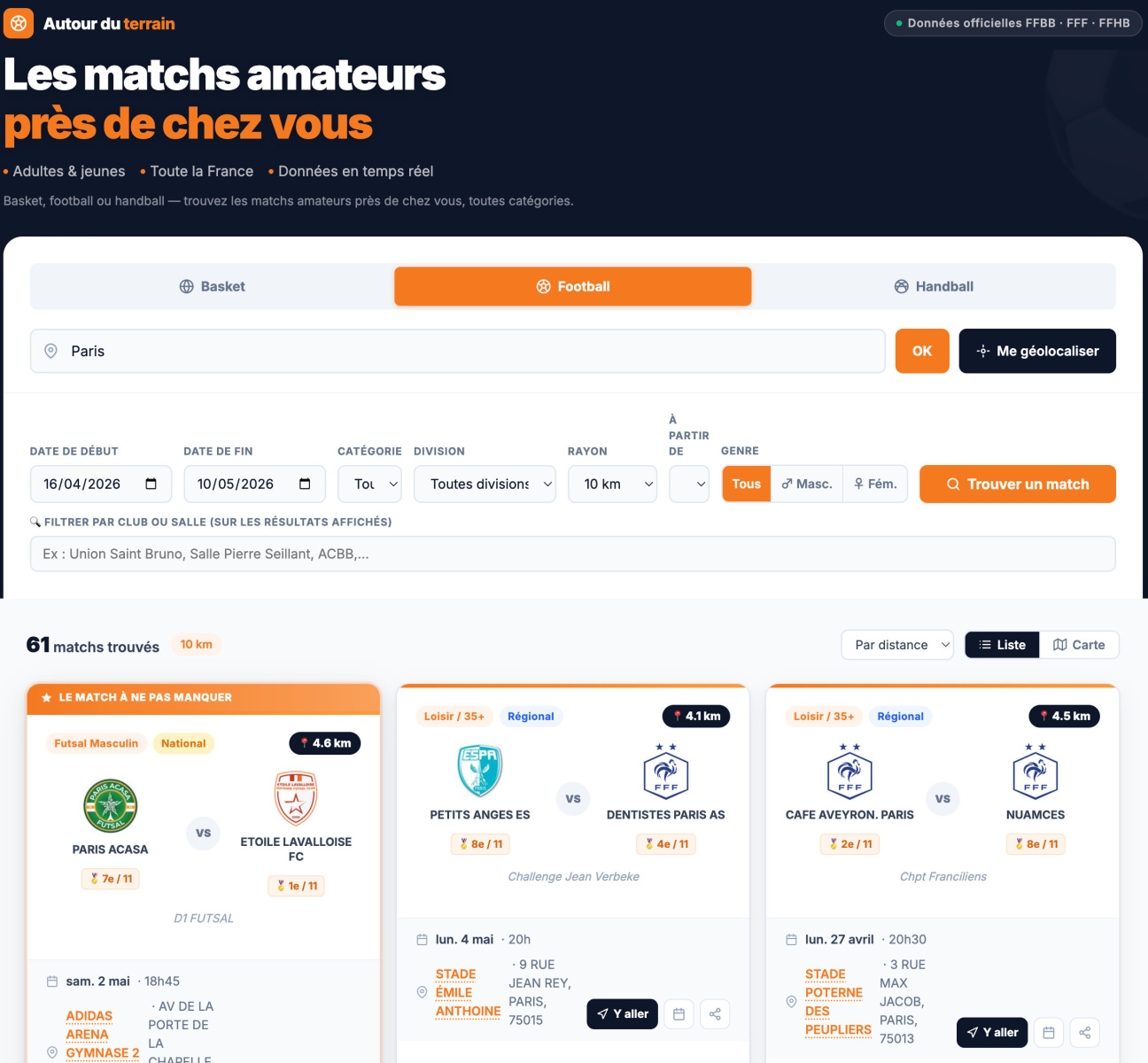 Le principe est simple : entrez votre ville ou laissez-vous géolocaliser, choisissez votre sport (football, basket ou handball), un rayon et une plage de dates — et le site affiche instantanément tous les matchs amateurs à proximité, triés par distance. Les données sont issues directement des bases officielles des fédérations (la FFF, la FFBB et la FFHB), et synchronisées en temps réel.