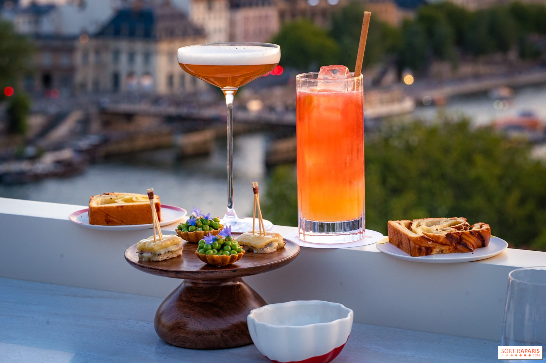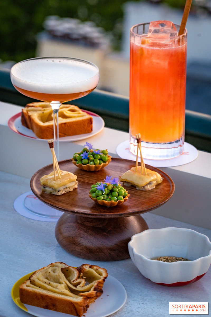 Kai dangus nusidažo rausva ir oranžine spalvomis, atmosfera sušvelnėja ir įvyksta magija. A la carte meniu kiekvieną kokteilį lydi subtilūs užkandžiai, kuriuos sukūrė virtuvės šefas Arnaud Donckele. Mūsų apsilankymo metu aptikome Comté babka su baklažanų tartaru, croque fromage ir sezoninį žirnelių tartaletą.