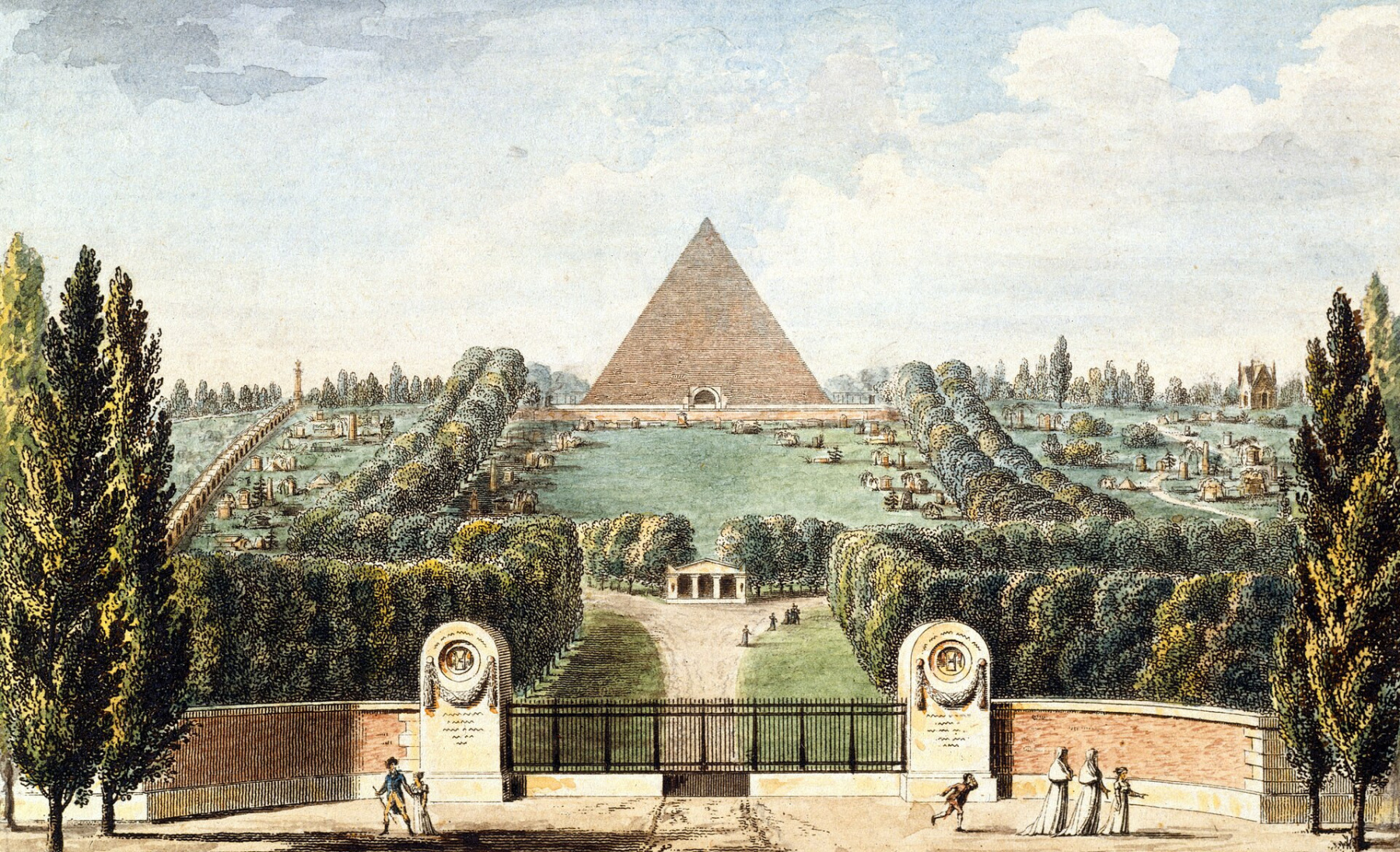 Kad Napoleons 1800. gadu sākumā norādīja izveidot lielu kapsētu „ārzemēs”, reaģējot uz Parīzes kapsētu pārplūdumu, arhitekts Aleksandrs-Teodors Brongniarts – tas, kurš arī būvēja Parīzes biržu – piedāvāja drosmīgu ideju: uzcelt milzīgu piramīdu vietas centrā. Šīs ieceres mērķis bija radīt monumentu, kas kļūtu par atvērta svētvietas vietu visām ticībām, simbolu Parīzes vienotībai svētku laikā, kad tā pārbūvēja savu pilsētplānošanu.