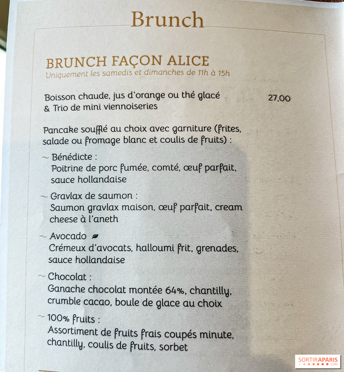 Brunch izvēle ir fiksēta par 27 €. Sākam ar karstu dzērienu, apelsīnu sulu vai atspirdzinošo tēju, ko papildina trīs mini konditorejas izstrādājumi. Tad pienāk galvenais brīdis: pankūkas, kas pieejamas gan sāļās, gan saldās versijās. Sāļajā variantā mums ir trīs izvēles: Bénédicte ar kūpinātu cūkgaļas krūtiņu, Comté AOP sieru, perfektu olu un holandiešu mērci, mājas lašu Gravelax ar perfektu olu un krējuma sieru ar diļļiem vai Avocado ar krēmīgu avokado, ceptu halloumi sieru, granātāboliem un holandiešu mērci. Saldummīļiem ir divas izvēles: šokolādes versija ar 64 % ganache, putukrējumu, kakao crumble un saldējumu vai 100 % augļu versija ar svaigu augļu izlasi, putukrējumu, coulis un sorbetu.