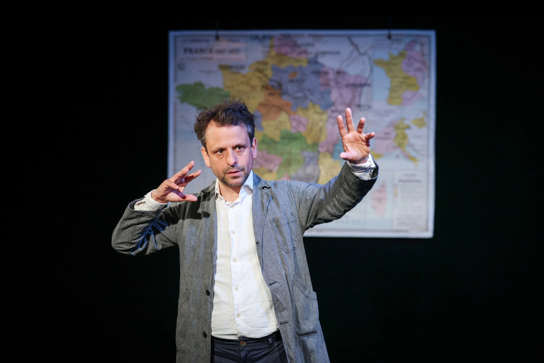 De voorstelling heeft de vorm van een belichaamde les, geïnspireerd door de leraren van weleer: grijze blouse, kaart van Frankrijk en pedagogische houding. Deze scenische benadering, die in het dossier wordt beschreven, maakt het mogelijk om het geschiedenisonderwijs om te zetten in een levendig verhaal, gevoed door de taal van de grote schrijvers. Het licht van Alireza Kishipour begeleidt de overgangen tussen tijdperken en belangrijke figuren, en verbindt vertelling, verbeelding en ruimtelijke enscenering.