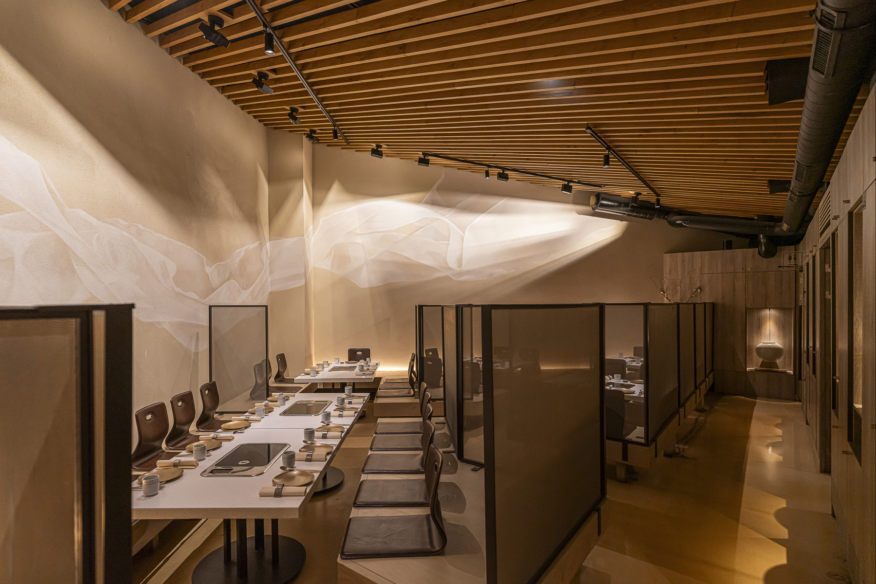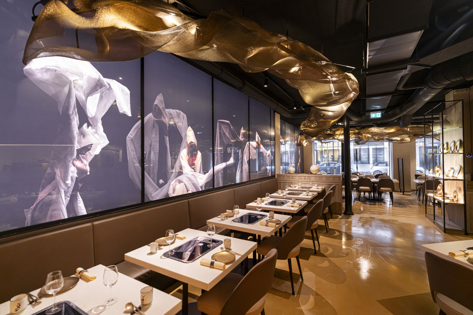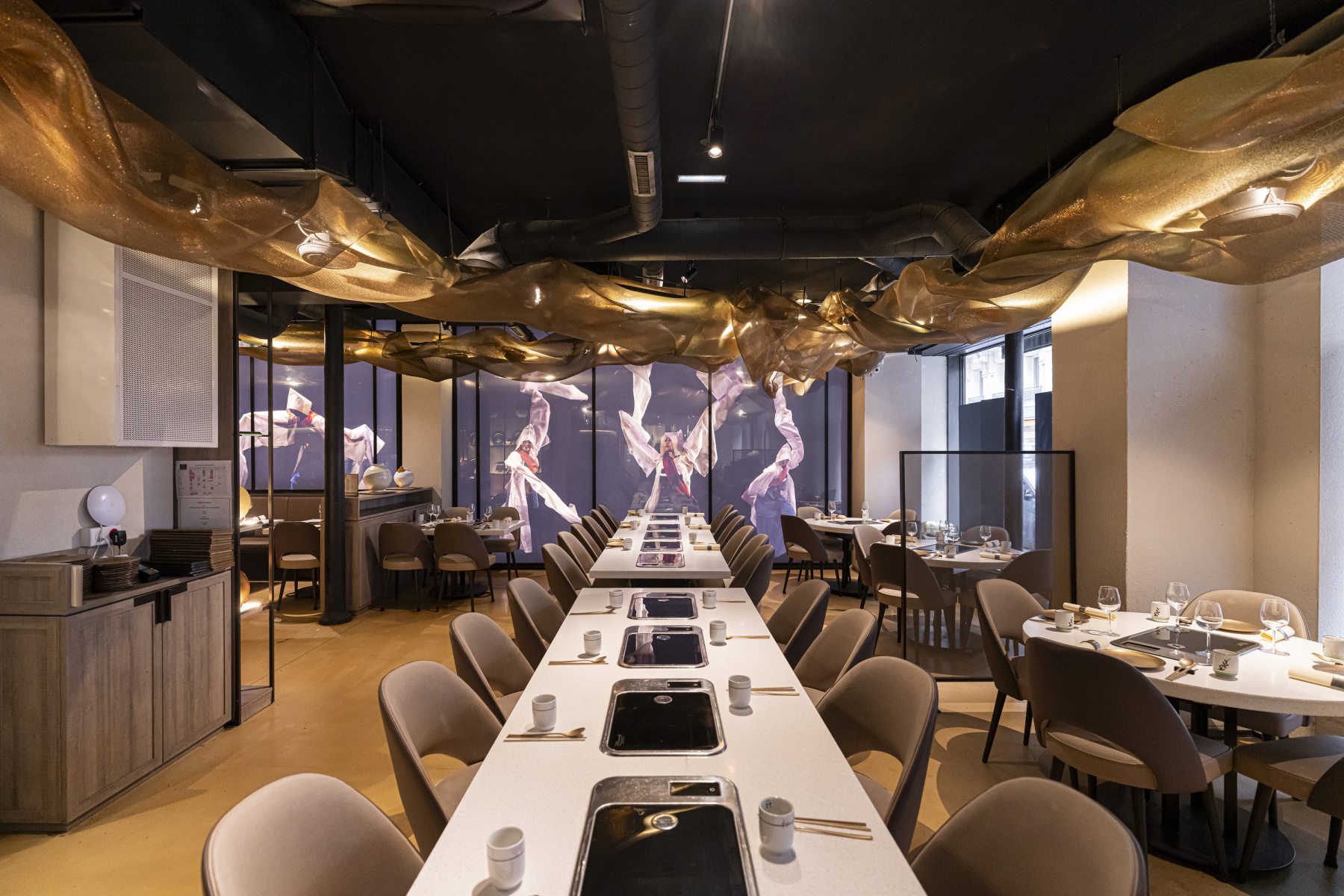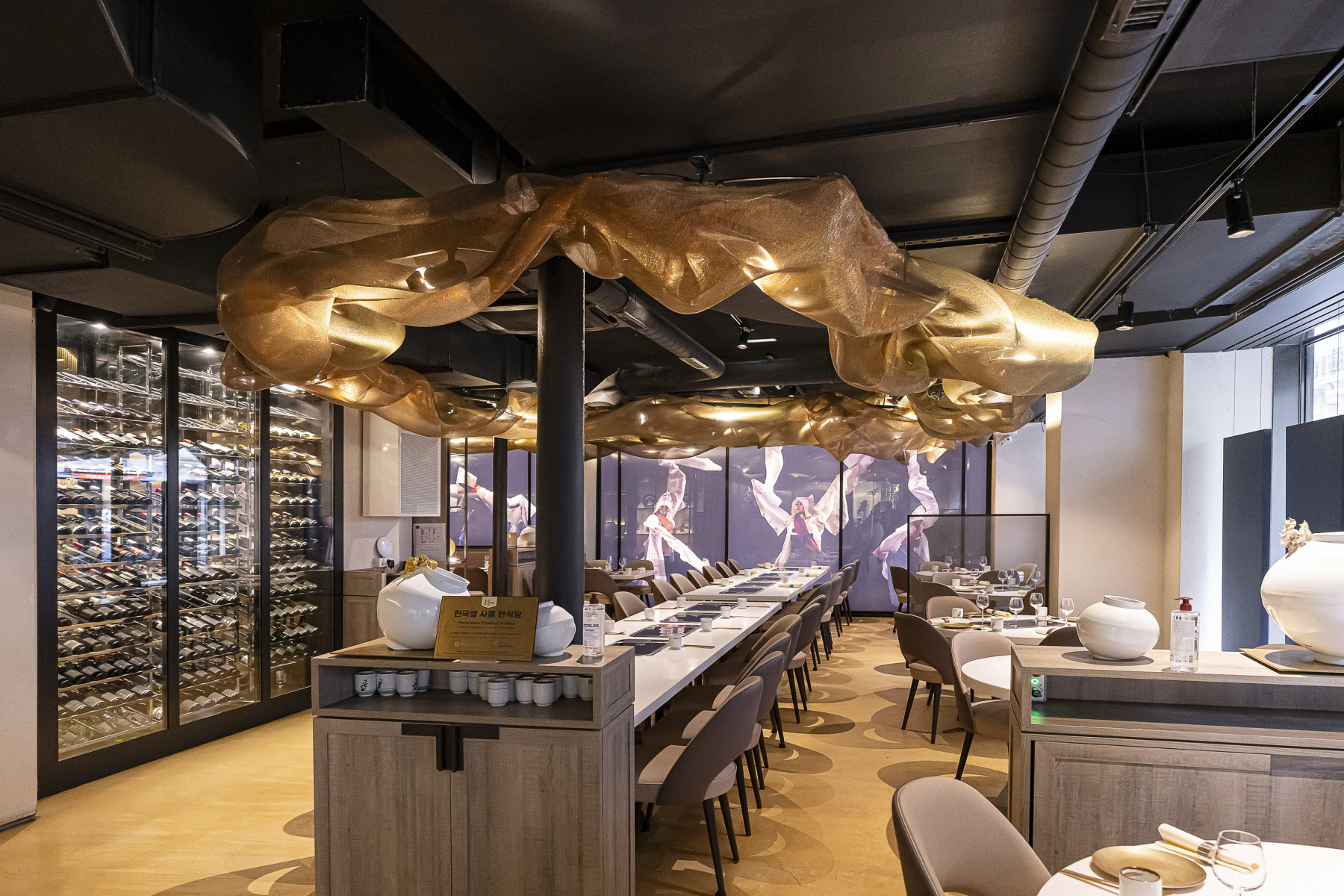Fra det øyeblikket du trår inn i restauranten, setter atmosfæren tonen. Stedet, som vant pris på Florence-biennalen, henter inspirasjon fra seungmu, en tradisjonell koreansk danse preget av eleganse og stillhet. Alle gjenstandene – keramikk, treverk og messingservice – er utformet av dyktige håndverkere i Korea før de ble plassert i lokalet.