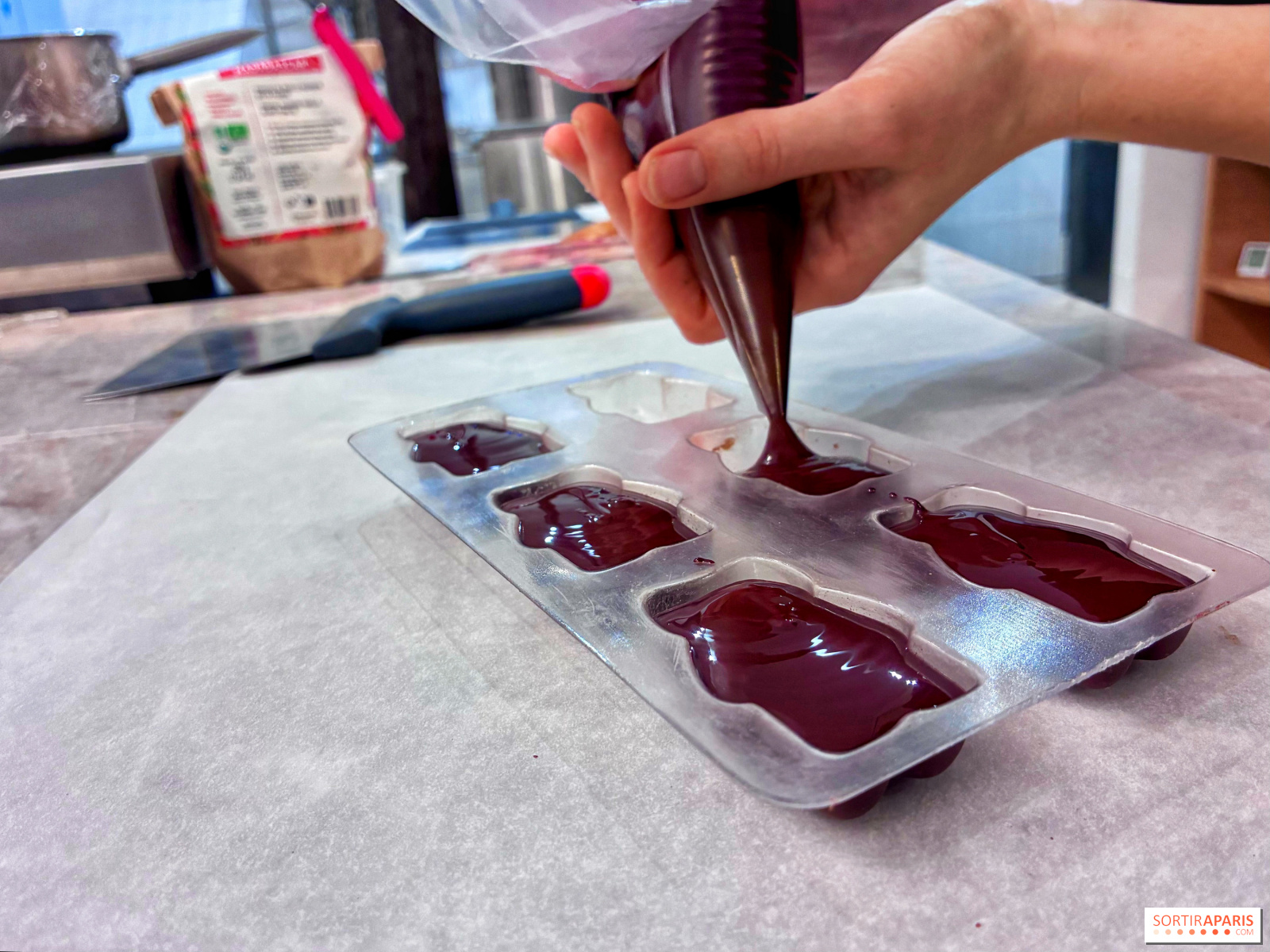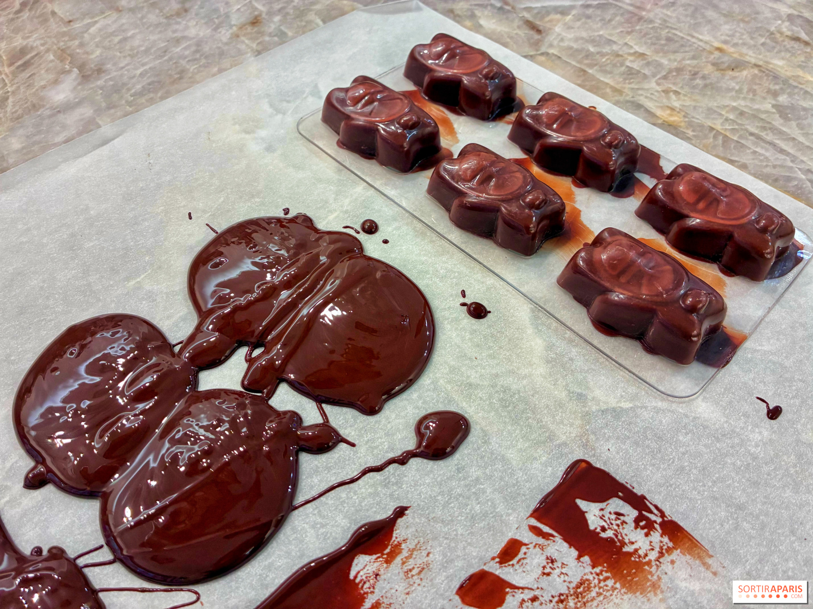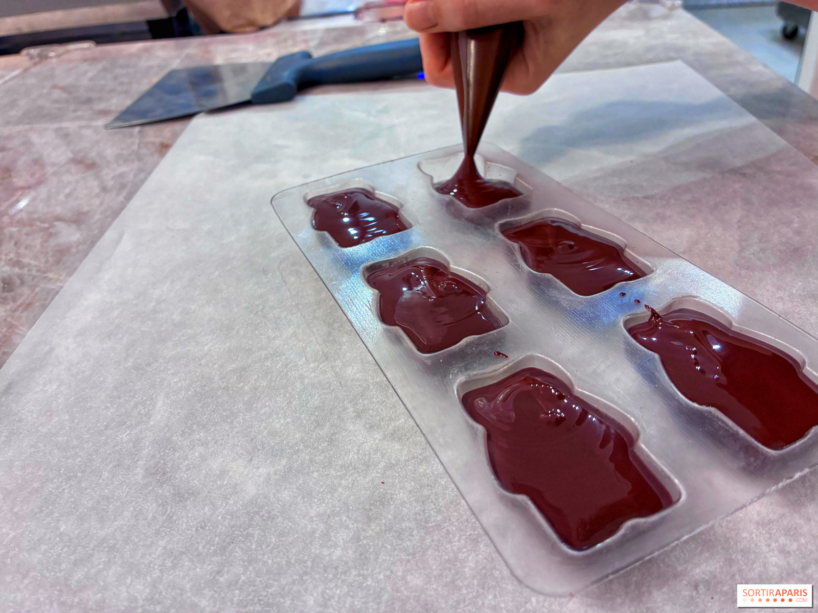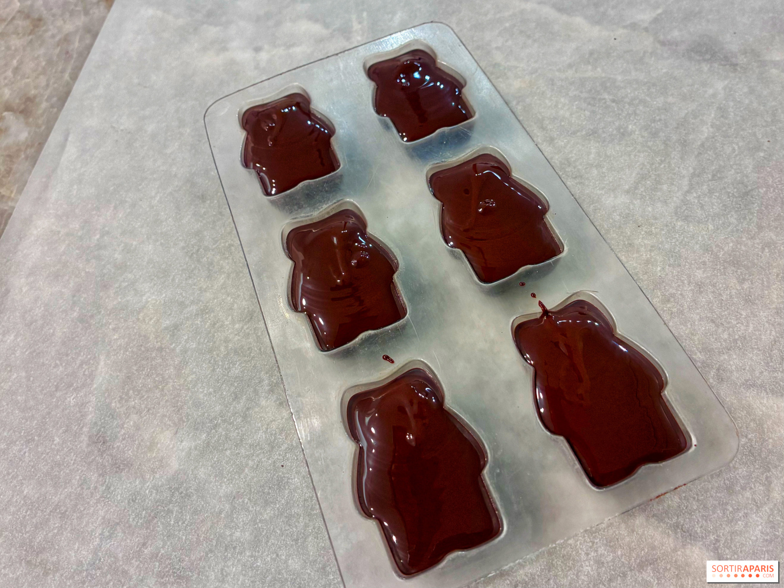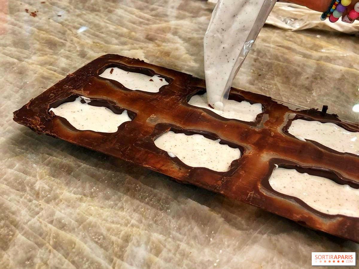 Vi går tilbake til sjokolade-maskinen for å legge et tynt lag over kremen, rett på marshmallowen, for å forsegle hele skapelsen. Deretter lar vi den hvile før vi vender den ut av formen og drar hjem med disse skjønne små bjørnene! Forresten, det er mulig å delta på dette kurset på engelsk ved privat booking, perfekt hvis du er på ferie i hovedstaden.