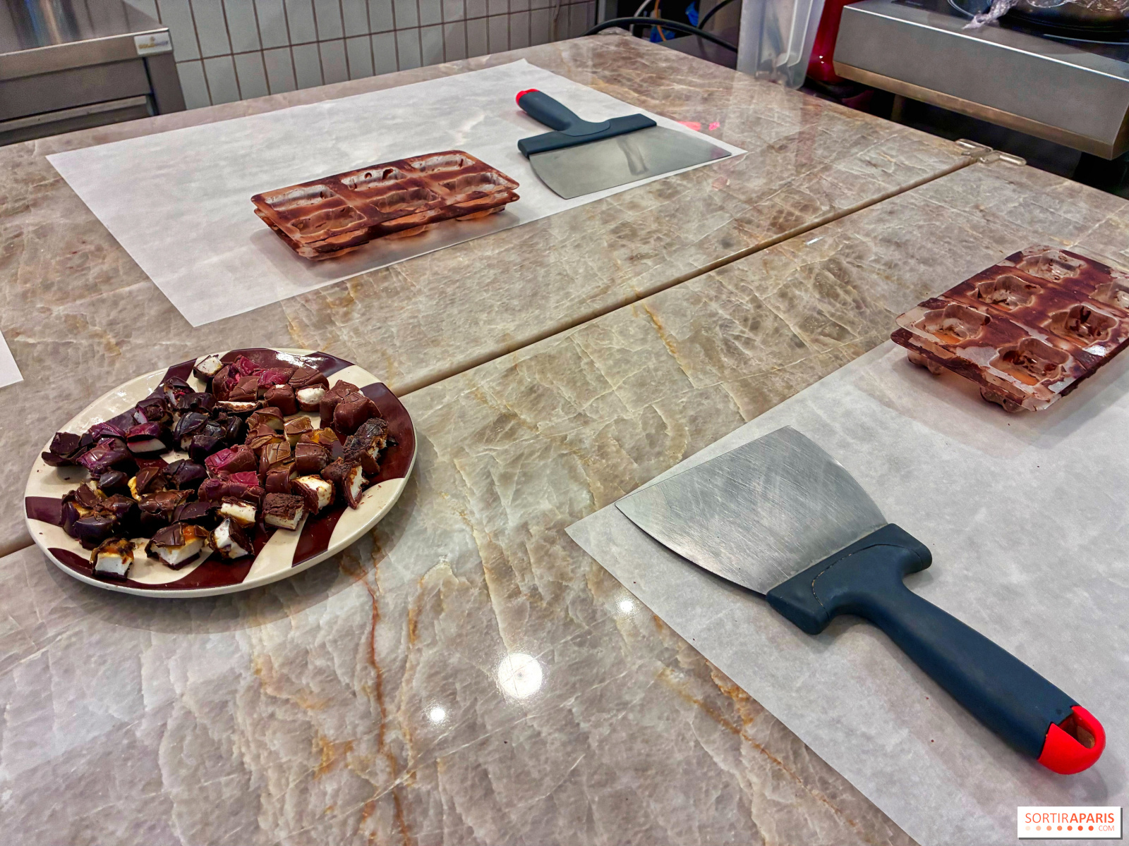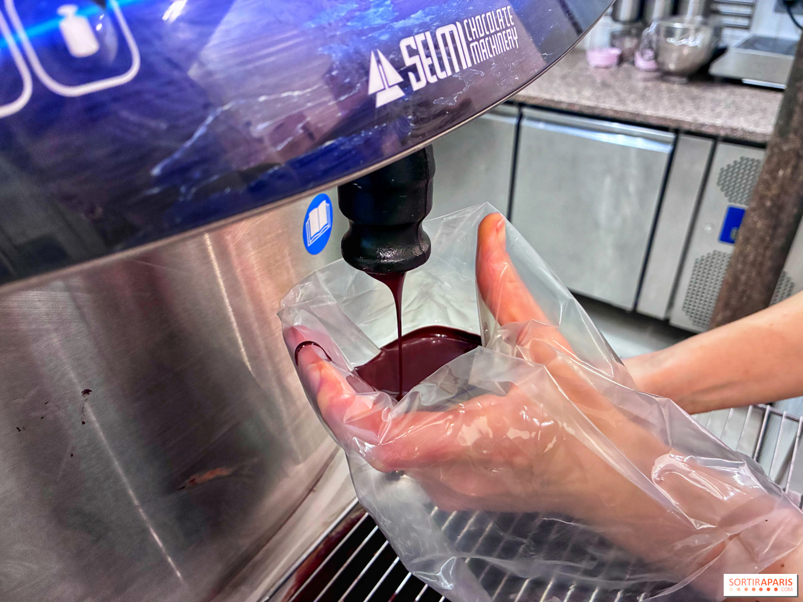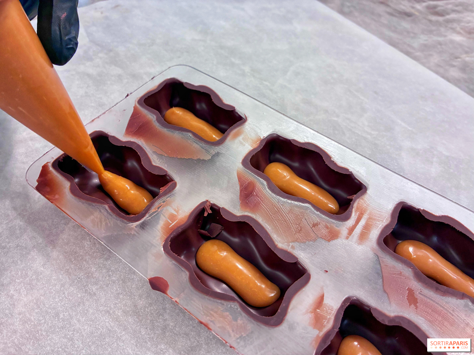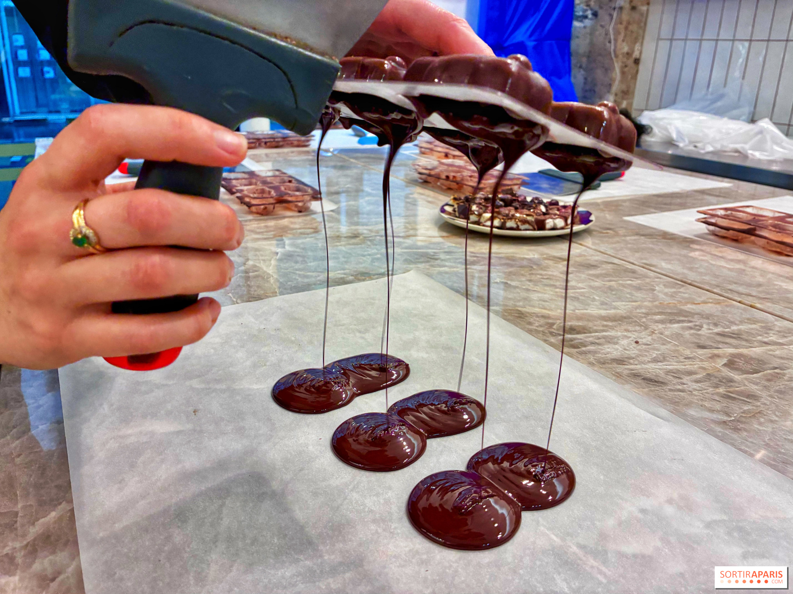 Vi går tilbake til sjokolade-maskinen for å legge et tynt lag over kremen, rett på marshmallowen, for å forsegle hele skapelsen. Deretter lar vi den hvile før vi vender den ut av formen og drar hjem med disse skjønne små bjørnene! Forresten, det er mulig å delta på dette kurset på engelsk ved privat booking, perfekt hvis du er på ferie i hovedstaden.