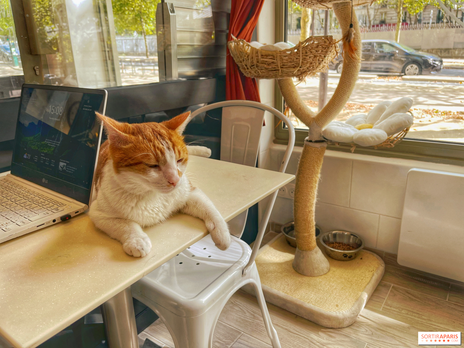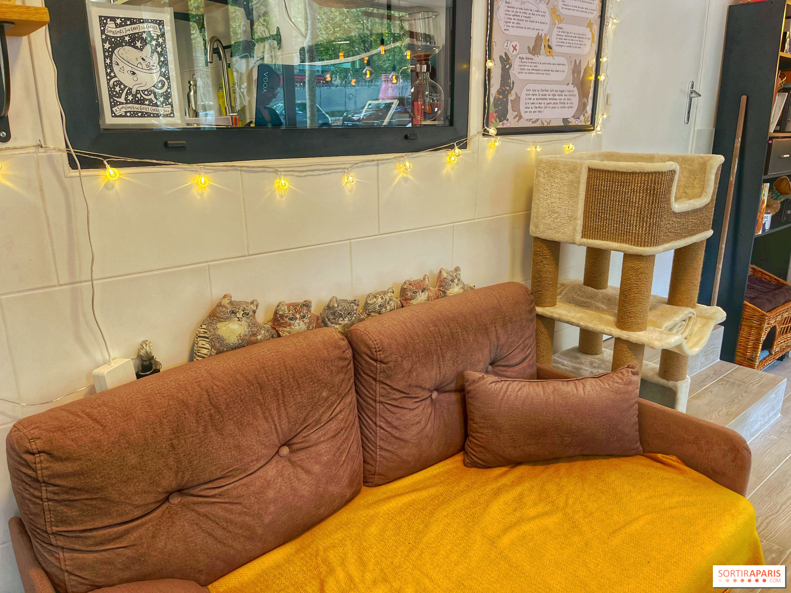 W przeciwieństwie do niektórych kocich kawiarni, w których koty wydają się leżeć jeden na drugim, każdy z nich ma swoją własną przestrzeń, zwłaszcza że nie ma ich zbyt wiele: sześciu mieszkańców. Wystarczająco dużo, aby odpowiednio się nimi zaopiekować i zapewnić im dobre życie i towarzystwo poza schroniskiem BooGlaw, z którym kawiarnia jest partnerem, czekając na swoich przyszłych właścicieli. W czasie naszej wizyty, zaledwie tydzień po otwarciu, dwa koty znalazły już swoje nowe rodziny w sąsiedztwie i czekały, aby do nich dołączyć!