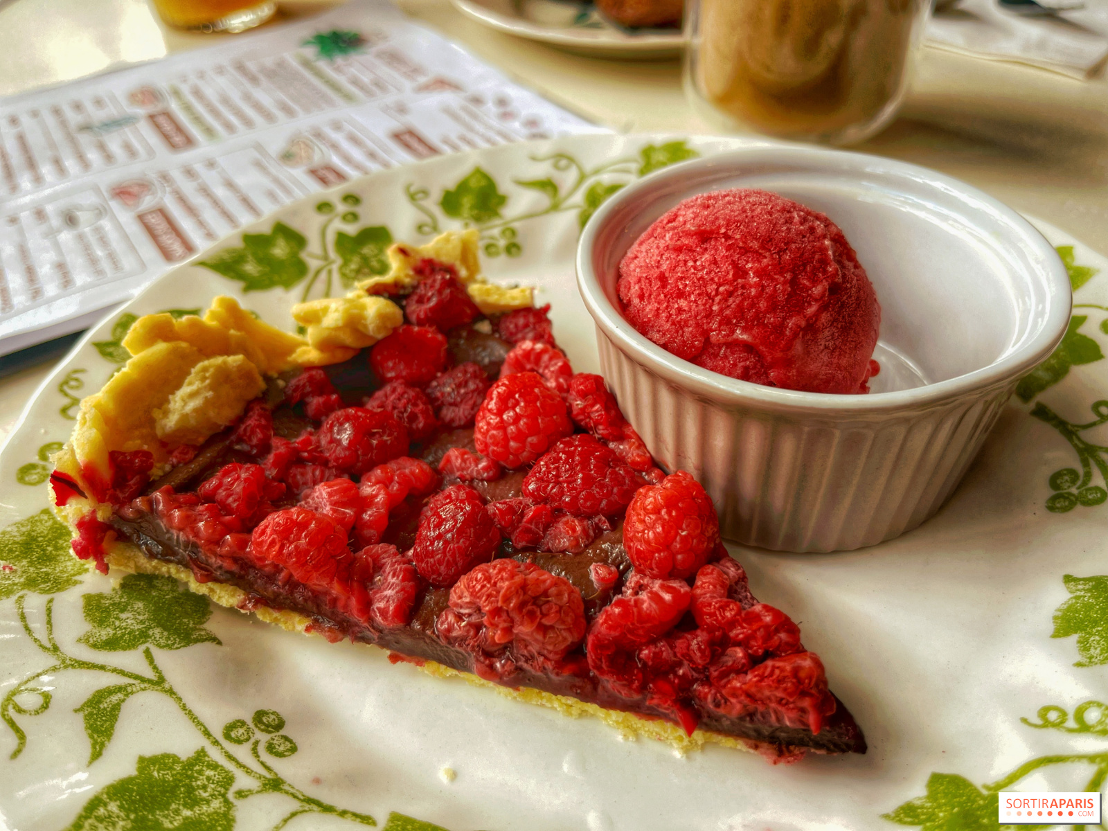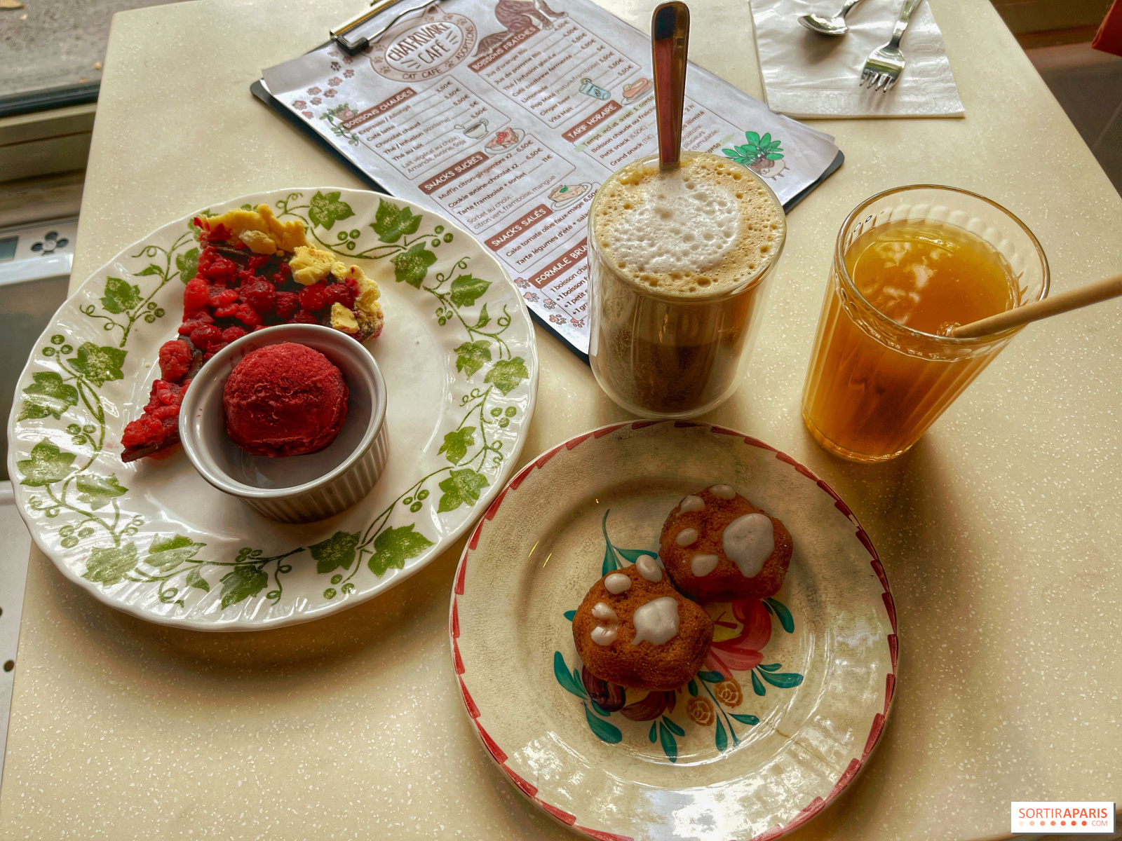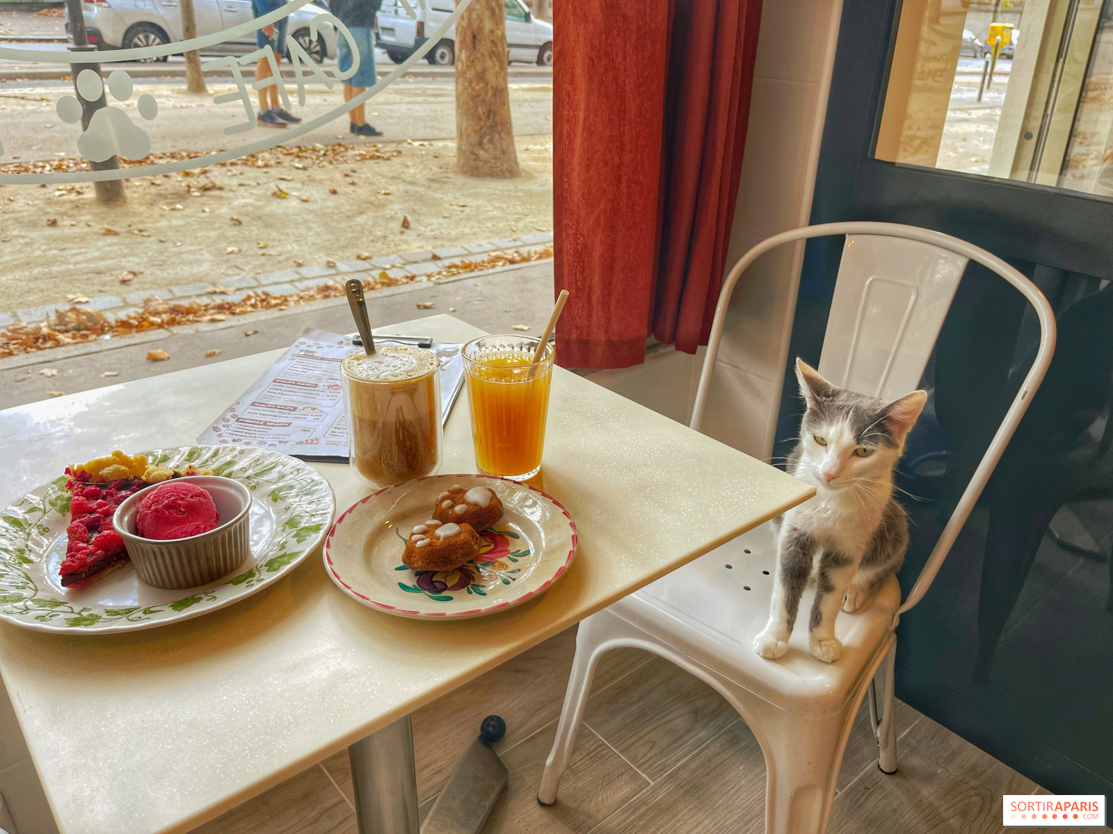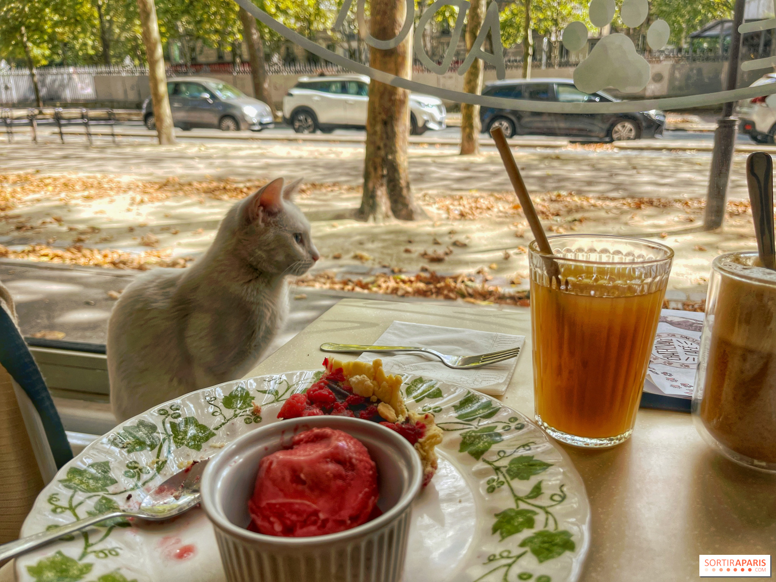 Na przekąskę wybraliśmy urocze babeczki cytrynowo-imbirowe (6,5 €) w kształcie kocich łapek, rozpływające się w ustach, ale także tartę malinowo-czekoladową z gałką sorbetu malinowego (11 €), dla odrobiny energii i rozkoszy na talerzu, a wszystko to w towarzystwie soku jabłkowego i café latte. Pyszna chwila z Pearl, która była zdeterminowana, aby pozostać na kaloryferze obok nas, aby obserwować ulicę i przechodniów, którzy również byli zaskoczeni!
