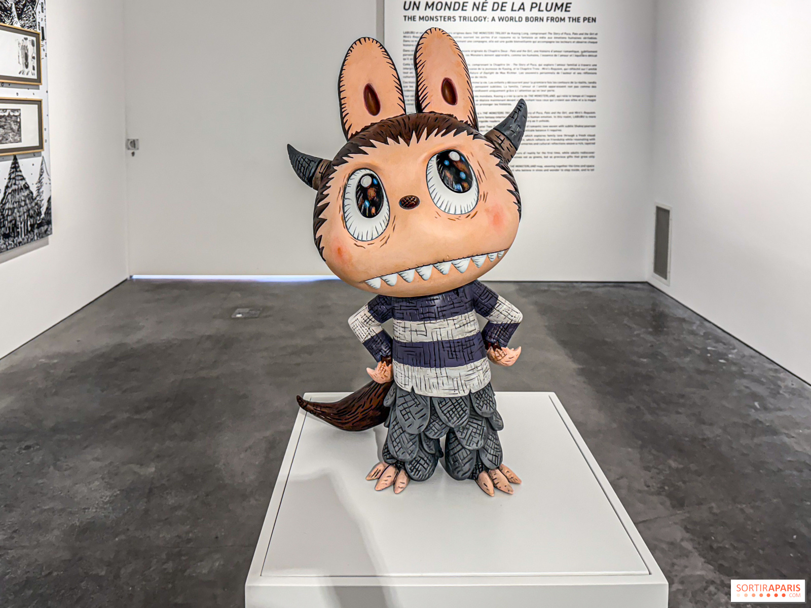 Organizada pela POP MART e pela How2work, a exposição apresenta esboços originais e figuras de coleção da série THE MONSTERS. Em Paris, o público pode explorar a trajetória de Labubu, personagem central de um universo que vem sendo desenvolvido há mais de uma década. O percurso se divide em diversos espaços, incluindo quadro, esculturas, livros ilustrados e até uma área imersiva dedicada às pelúcias Labubu. Uma linha do tempo também destaca os dez anos de parceria entre Kasing Lung e How2work.