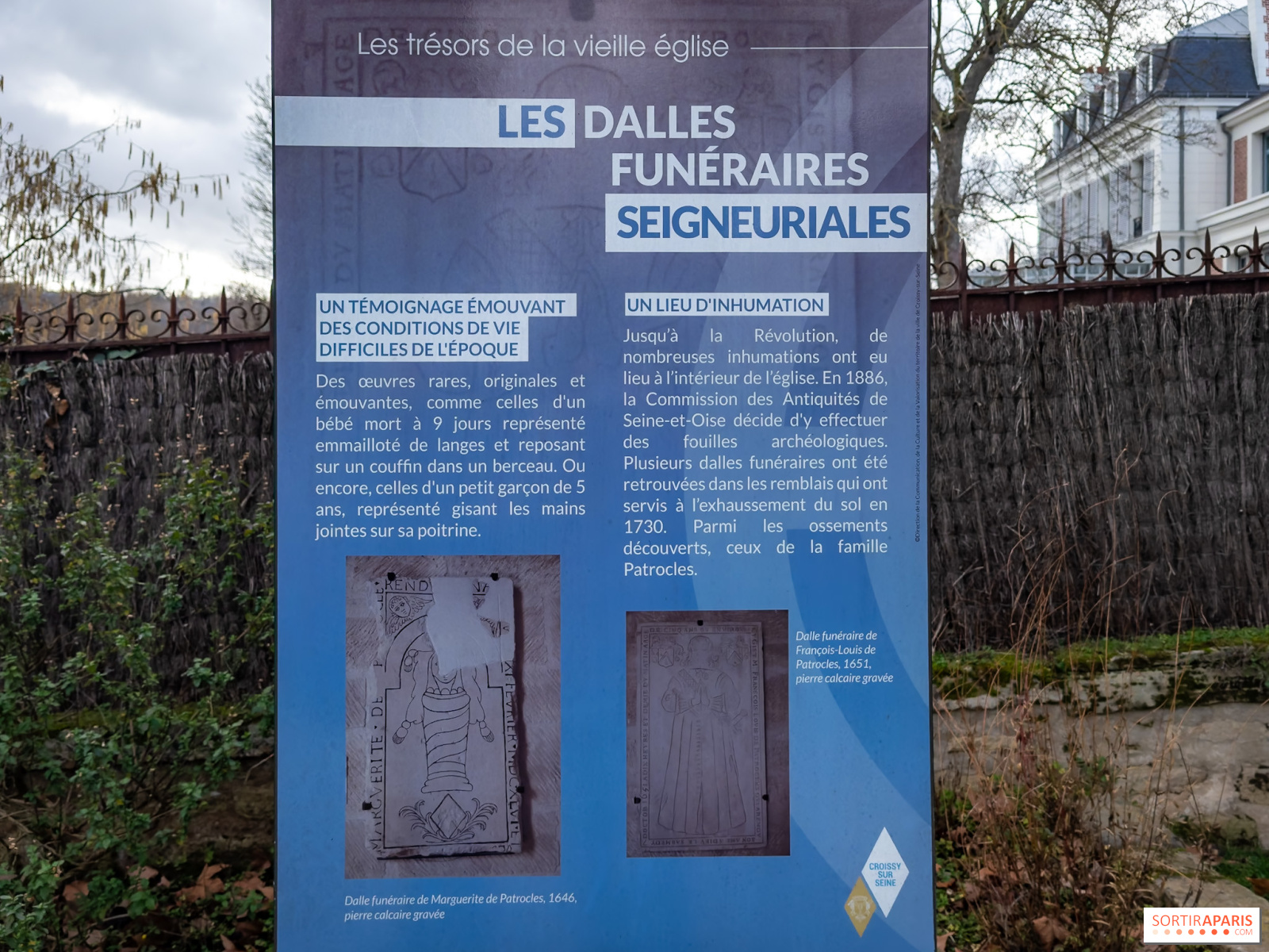 Ainda se pode ver nas paredes a enigmática tábua funerária, aquela faixa negra adornada com os bras da família Patrocle. No solo, foram descobertas lajes funerários dos séculos XVII e XVIII, incluindo os da linhagem Patrocle, durante escavações arqueológicas realizadas em 1886 pela Comissão de Antiguidades de Seine-et-Oise. Entre os ossos exumados, acredita-se que estejam os do próprio senhor de Croissy.