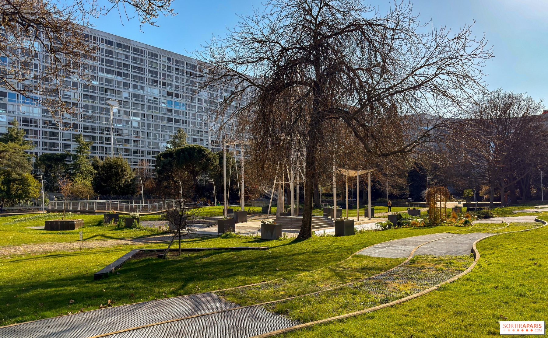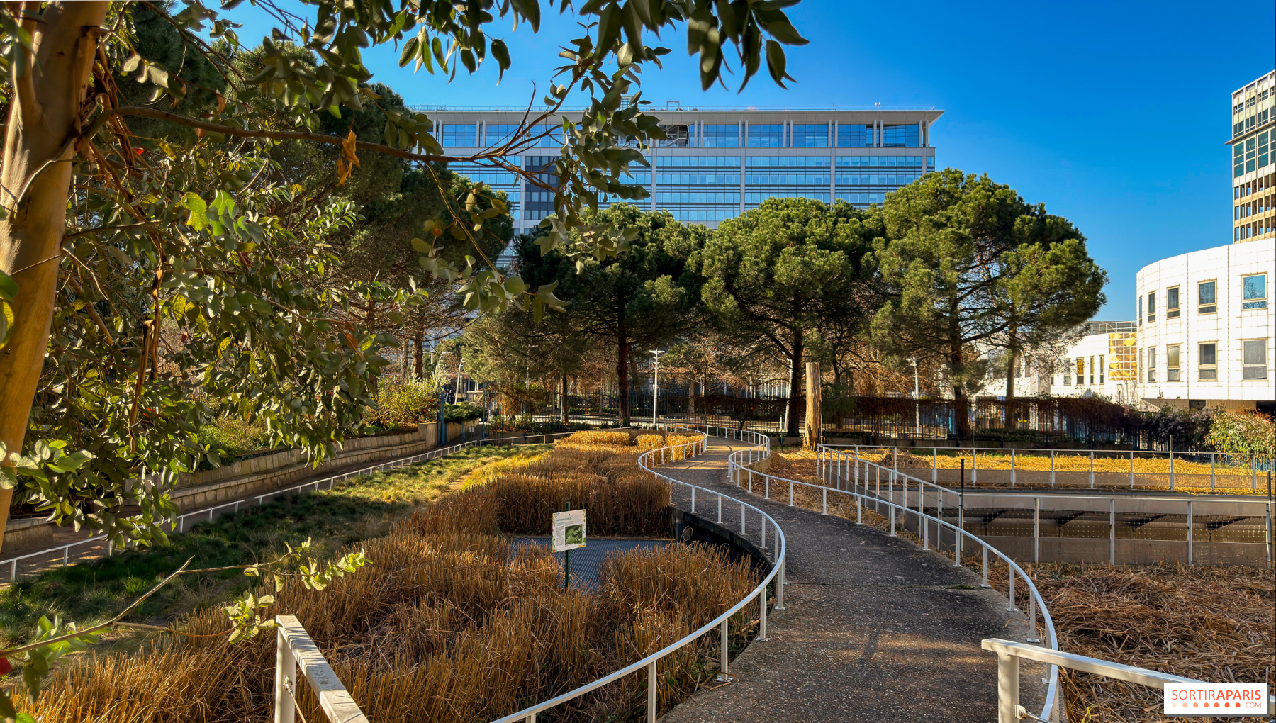 Basta atravessar a passarela a céu aberto, que serpenteia ao longo do parque e conecta as duas entradas — seja vindo da estação de trem (direção Hall 2, escadaria "Jardim") ou pela Alameda da 2ª D.B. — para mudar de perspectiva. Entre a vegetação exuberante, a vista revela um cenário surpreendente: as folhagens em primeiro plano e a Torres Montparnasse ao longe.