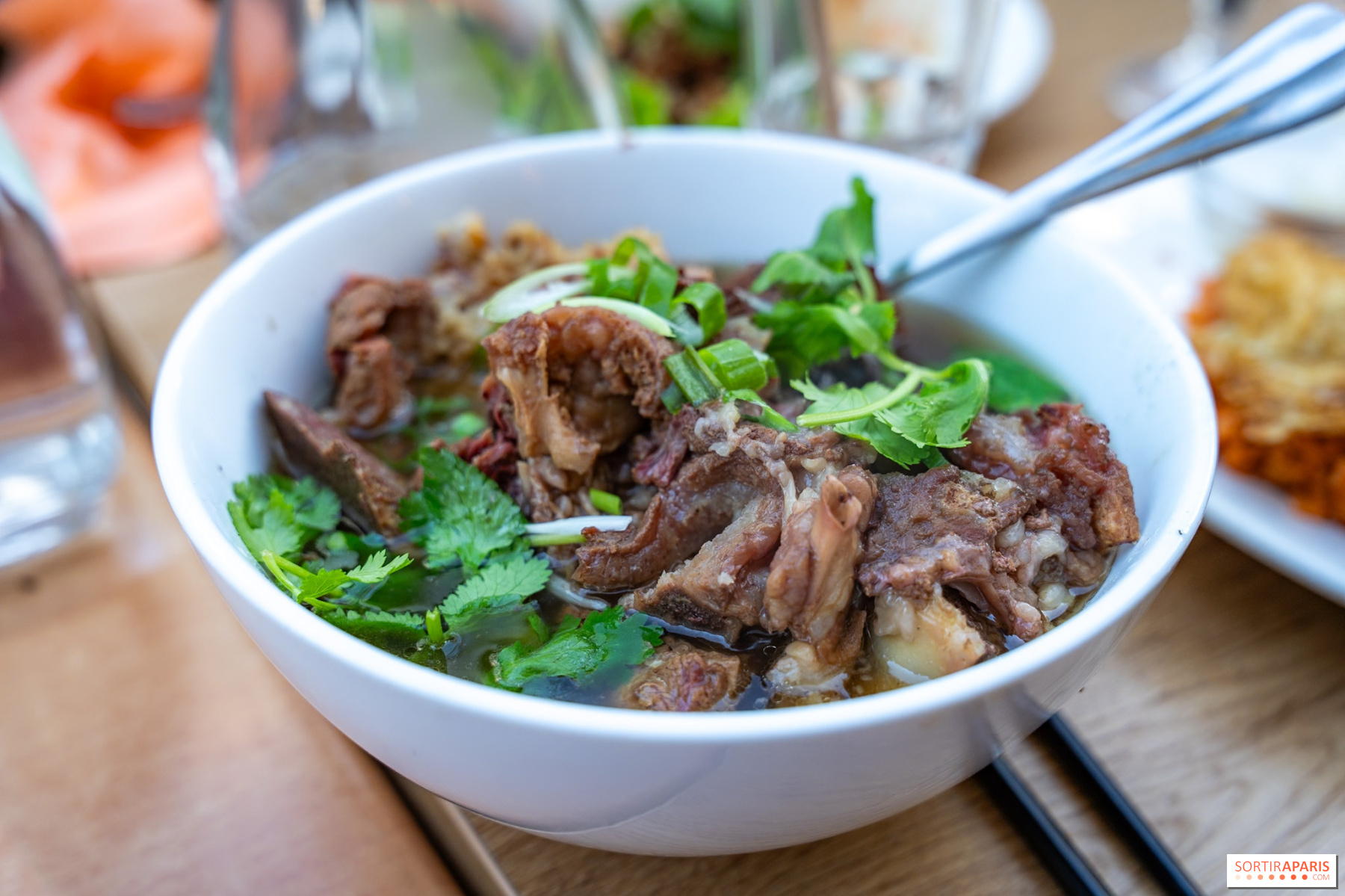 Também nos deliciámos com uma boa sopa de raviólis de camarão, cujo caldo era muito saboroso. Como estamos a chegar ao fim do serviço, a proprietária oferece-nos gentilmente uma tigela de caldo de phở recheada com carne de vaca cozida ultra-macia, que nos delicia. Uma coisa é certa, vamos voltar para provar o seu phở.