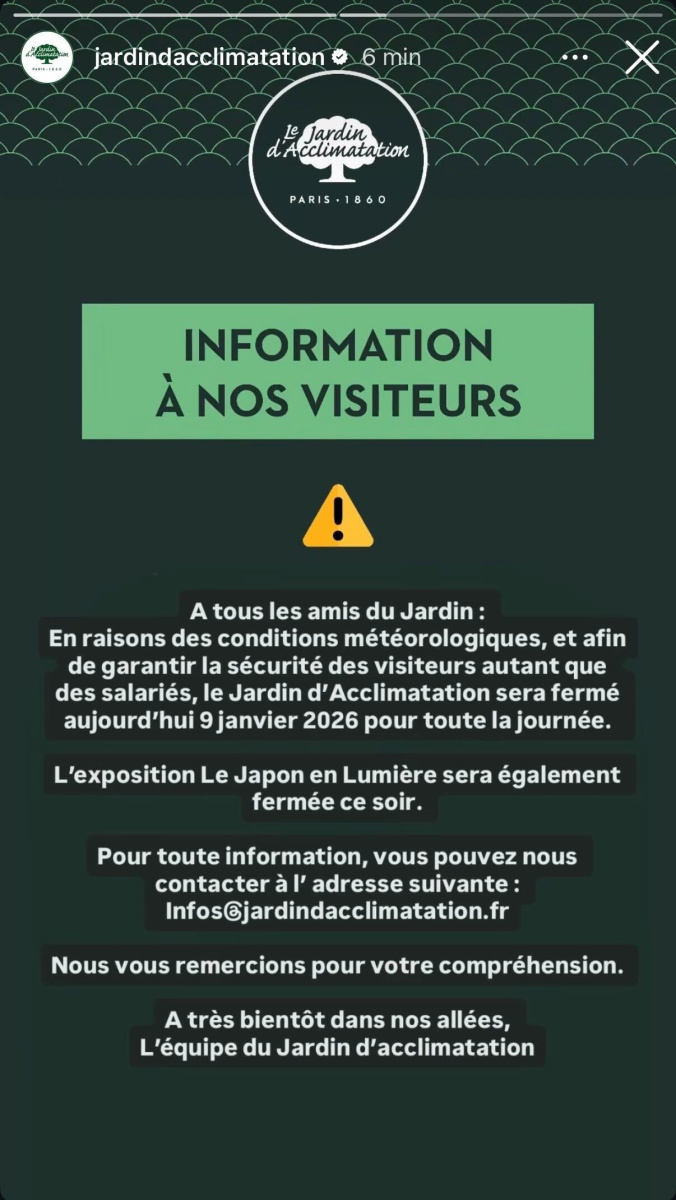 În condițiile actuale și pentru a asigura siguranța vizitatorilor și angajaților, Grădina de Acclimatizare a anunțat pe rețelele sociale și pe site-ul său o închidere excepțională. Astăzi, vineri, 9 ianuarie, grădina din arondismentul 16 rămâne închisă, ceea ce duce și la suspendarea instalației luminoase "Japonia în Lumină".