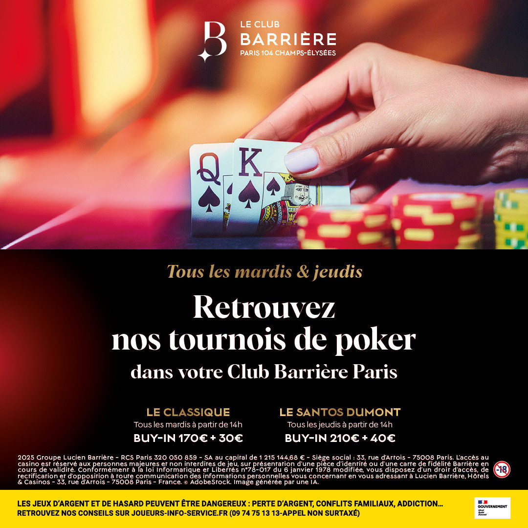 В клубе Barrière регулярно проводятся различные турниры. Classique проходит каждый вторник во второй половине дня с бай-ином €200 (20 000 фишек и 20-минутные уровни - повторный вход). Турнир Santos Dumont с бай-ином €250 проводится каждый четверг с 14:00. Регистрация по этой ссылке.