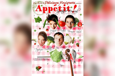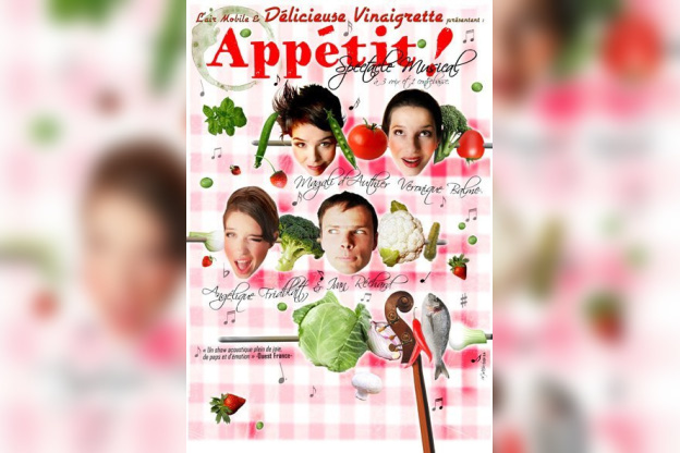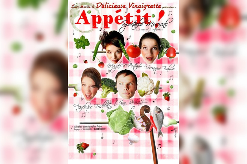 Après la merveilleuse adaptation de "Bulle ou la voix de l’océan" de René Fallet, la Compagnie Délicieuse vinaigrette revient avec un spectacle musical tout public sur l’appétit au sens large. Vins, fromages, fruits et légumes cohabitent donc pour notre plus grand plaisir dans cette fantaisie roborative, sensuelle et explosive. Sur un rythme endiablé et avec un bel ensemble, le quatuor enchaîne chansons, textes et intermèdes autour de l’appétit des mets, de vivre ou encore de chanter.