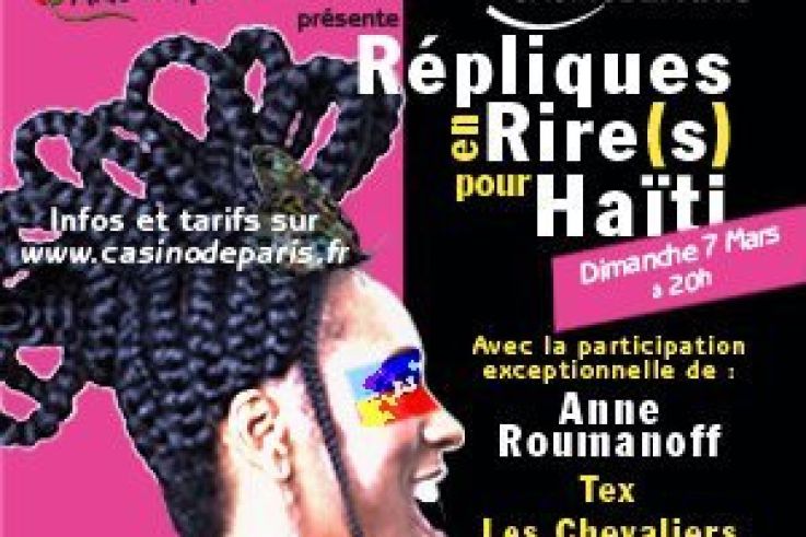 Soutenir Haiti peut aussi passer par l'humour. Alors vous aussi, venez rire et vous divertir le 07 mars prochain au Casino De Paris avec des artistes solidaires et engagés : Anne Roumanoff, Tex, Les Chevaliers du Fiel, Luc Lemoine, Sandrine Alexi et bien d'autres...