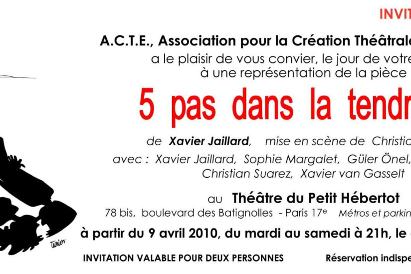 Après 150 représentations de la pièce "Après l'Incendie", le Petit Hébertot prend ses quartiers de printemps à l'ombre de la tendresse. Xavier Jaillard, adaptateur de "La vie devant soi", est l'auteur de six actes courts à deux personnages, six histoires qui n'auraient aucun lien entre elles si la tendresse n'y jouait chaque fois un rôle essentiel et déterminant. Deux jeunes au bord de la rupture ; deux vieillards arrachés à leur pavillon et relogés en haut d'une tour ; deux astronautes chargés de concevoir un enfant dans l'espace ; une grand-mère au parloir de la prison de son petit-fils ; la visite impromptue d'un homme politique chez sa mère ; la rencontre d'une étrange inconnue et d'un comédien dans sa loge...
