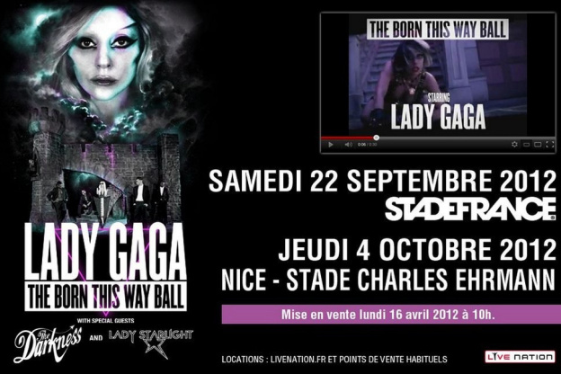 Alors, il va falloir faire preuve de rapidité ! Notez bien : les places seront disponibles, tout d’abord sur le site du producteur de Lady Gaga, www.livenation.fr, dès le vendredi 13 avril, avant d’être accessibles, dans tous les points de vente habituels, dès le lundi 16 avril 2012 à partir de 10 heures !
