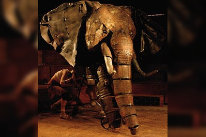 Spartacus, tenant tête aux deux chefs chanteurs lyriques, trois comédiens muets animent des dizaines d'objets et d'animaux aux mécanismes ingénieux. Jouant de procédés presque cinématographiques, ils foulent le sable du désert et excitent leurs armées au pied du Vésuve. Ils donnent corps à des milliers de révoltés. Le métal claque, la terre s'enflamme, les voix s'élèvent...