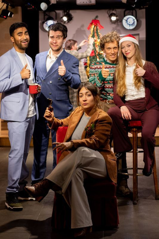 Sur le fond, Joyeuses Fêtes repose sur une situation simple et lisible : un grand bilan d’année, des salariés réunis, une direction sous tension, et une série de détails qui déplacent peu à peu la soirée vers l’imprévu. Six comédien·ne·s incarnent les employés de l’entreprise fictive au milieu du public, ce qui favorise une circulation constante entre jeu théâtral et participation.