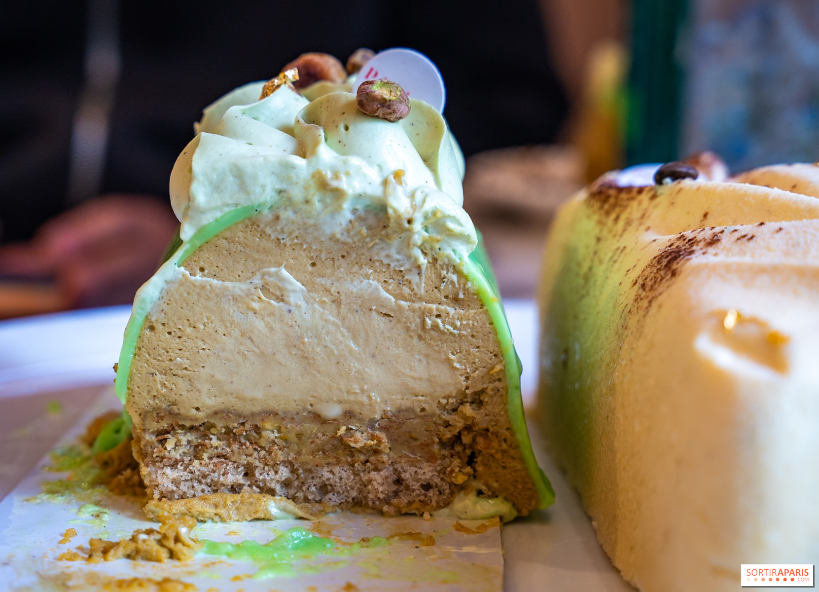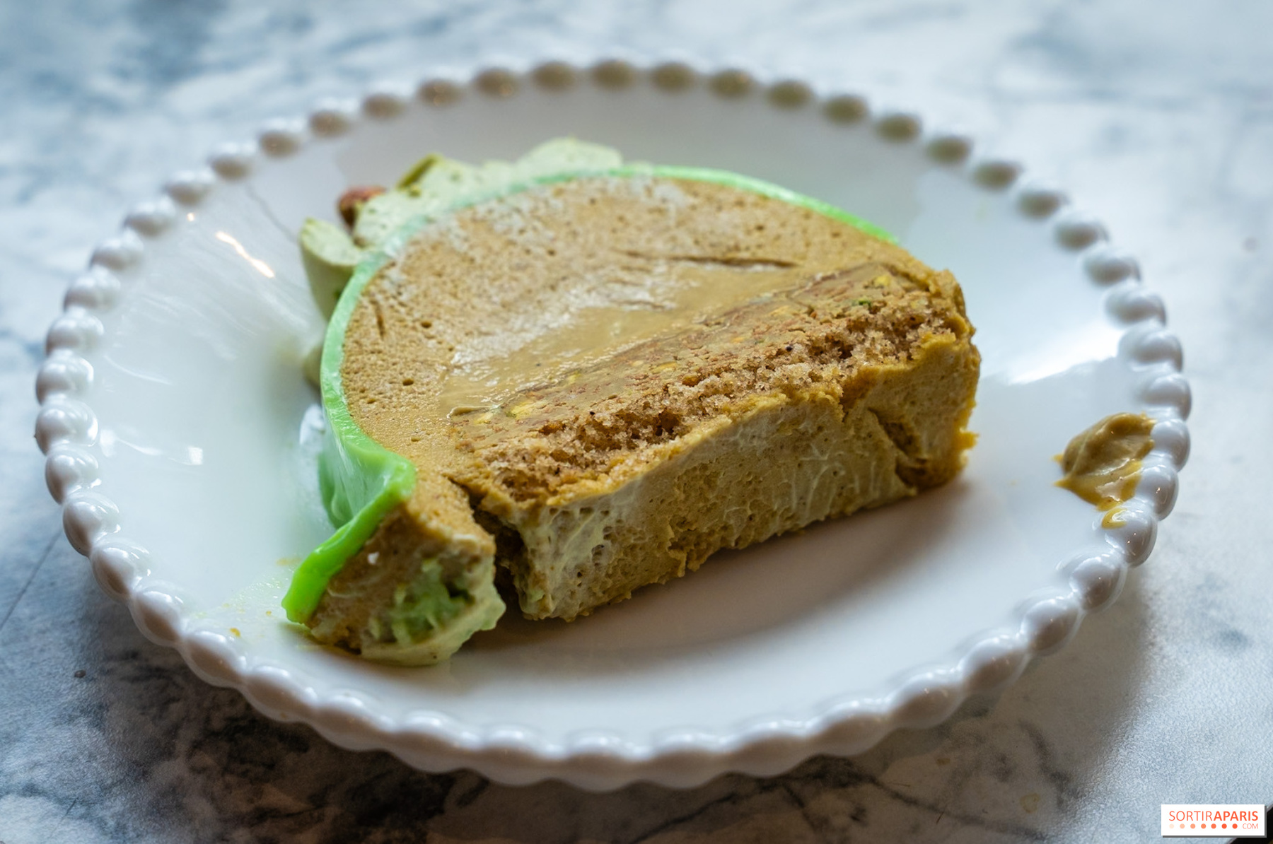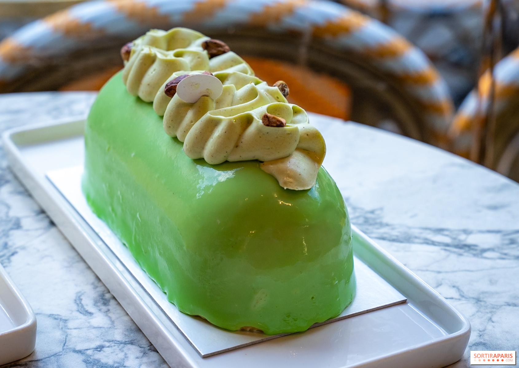 L'Or Vert oslavuje pistácie vo všetkých ich podobách. Na prvý pohľad by nás výrazná zelená farba mohla pripomínať priemyselný výrobok, ale vôbec to tak nie je. Nielenže obsahuje skutočné pistácie, ale farba pochádza z prírodného farbiva. Mäkký, chrumkavý, krémový, pralinový a dokonca aj pistáciovo-vanilkový mousse: tento koláč je veľkorysý a pre milovníkov tejto orientálnej príchute priam návykový. Celok dotvára pistáciová ganache, ktorá je korunou celého diela. Cena je 39 € pre 5 až 6 osôb.