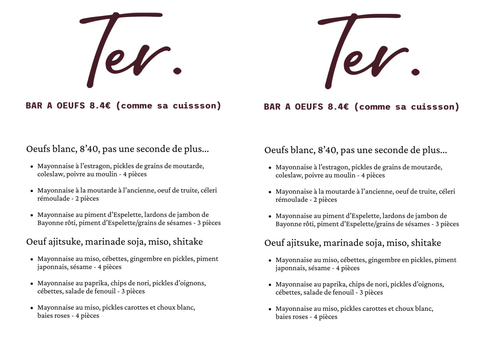 V živahnem okrožju Voltaire v 11. pariškem okrožju , Ter. je restavracija z le 30 prostori, ki lahko navduši ljubiteljejajc z majonezo. Od torka do nedelje od 18. ure ta restavracija v človeški velikosti sprejema radovedneže, ki iščejo toplo in sproščeno vzdušje, dodaten bonus pa je terasa s štirimi mizami in odpirajočim se pročeljem, ki tudi v notranjosti daje slasten vtis prostega zraka.