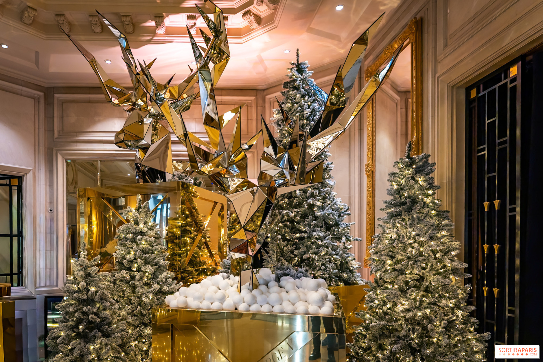 O hotel Four Seasons George V ni več potrebno predstavljati – ta legendarni naslov na aveniji George V vsako zimo okrasi s svojimi najlepšimi boemi za praznike. In letos je hotel resnično poskrbel za čarobno dekoracijo. Že ob vstopu ste povabljeni v pravljični svet z zasneženimi odtenki, kjer se mogočni polarni medvedi veselo družijo s elegantnimi jeleni. Bela-rdeča dodajajo pridih prefinjenosti, medtem ko se številna zelená drevesa ustvarjajo vzdušje pravljičnega gozda.