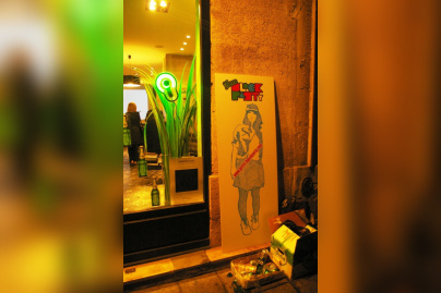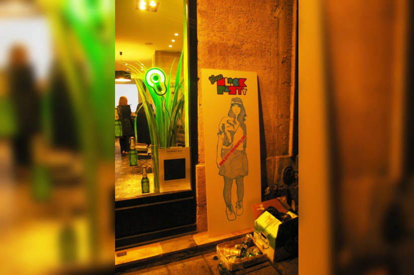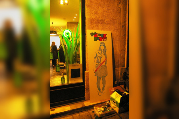 Rue Vieille du Temple, rue du Roi de Sicile et rue Sainte-Croix de la Bretonnerie. Trois rues du quartier du Marais déjà prises d’assaut quelques minutes avant 20h. Je constate qu’il y a déjà beaucoup de monde sur place. On peut dire que le bouche à oreille concernant cette opération marketing a bel et bien fonctionné. Une aubaine pour Grolsch et un pur bonheur pour les parisiens et les quelques passants venus déguster cette bière Hollandaise, nouvelle en France. Les boutiques (salon de coiffure, vendeur de motos ou encore vêtements) et les bars du Marais profitent eux aussi de cet événement. Certains d’entre eux ont accepté d’y participer en affichant des stickers, des affiches et autres goodies à l’effigie de la marque. Autre signe distinctif : une lumière verte, couleur de la bouteille Grolsch, est accrochée dans les vitrines des bars et à l’extérieur des boutiques. Enfin, et le plus important, des bières sont distribuées gratuitement. Pour ajouter de l’ambiance à cette soirée déjà festive, des DJs sont aux platines dans plusieurs bars et font danser les parisiens au son de l’électro.