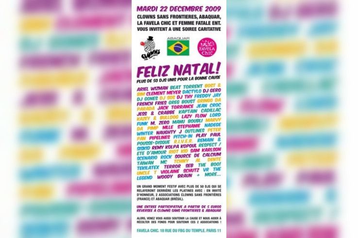 Un grand moment festif avec plus de 50 djs et collectifs qui se relayeront derrière les platines avec en invités d'honneur, 2 associations: Clowns Sans Frontières pour la France et Abaquar pour le Brésil.