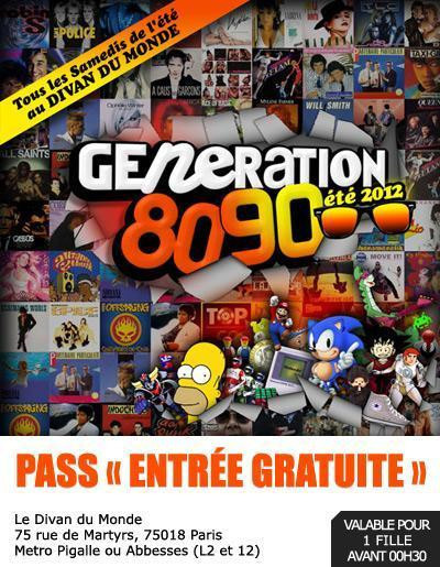 Après un début de saison exceptionnel au Bataclan, la "Generation 80-90" joue les prolongations jusqu'à début septembre dans le cadre mythique du Divan du Monde. Tu as grandi dans les années 80-90 ? Ta bouche était agrémentée d'un magnifique appareil dentaire ? Tu collectionnais les Pin's, les stickers Paninis et les "Crados" ? Tu pouvais lire ton âge au fond des verres à la cantoche ? Tu cherchais ton nom sur le générique du "Club Dorothée" (même si ce n'était pas ton anniversaire) ? Ta Gameboy était grise et avait 4 grosses piles ? Tu allais au collège avec ton 103 SP custom et le litre d'essence coûtait 5 Francs ? Cette soirée est faite pour toi !