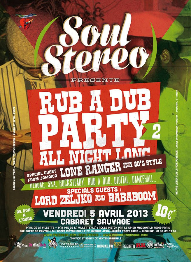 Dans la magnifique enceinte du Cabaret Sauvage & la plus grande tradition jamaïcaine, le Soul Stereo, Lord Zeljko, Bababoom & Lone Ranger vous ferront danser sous les bons rythmes du Reggae, Ska, Rocksteady, Roots, Rub A Dub, Digital, Dancehall jusqu’au bout de la nuit …