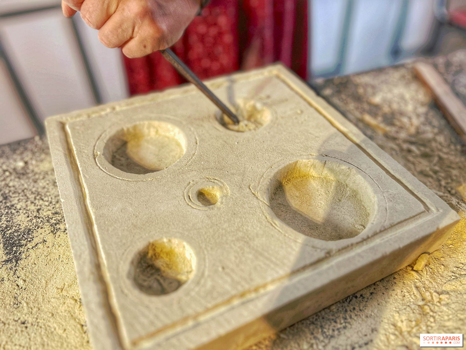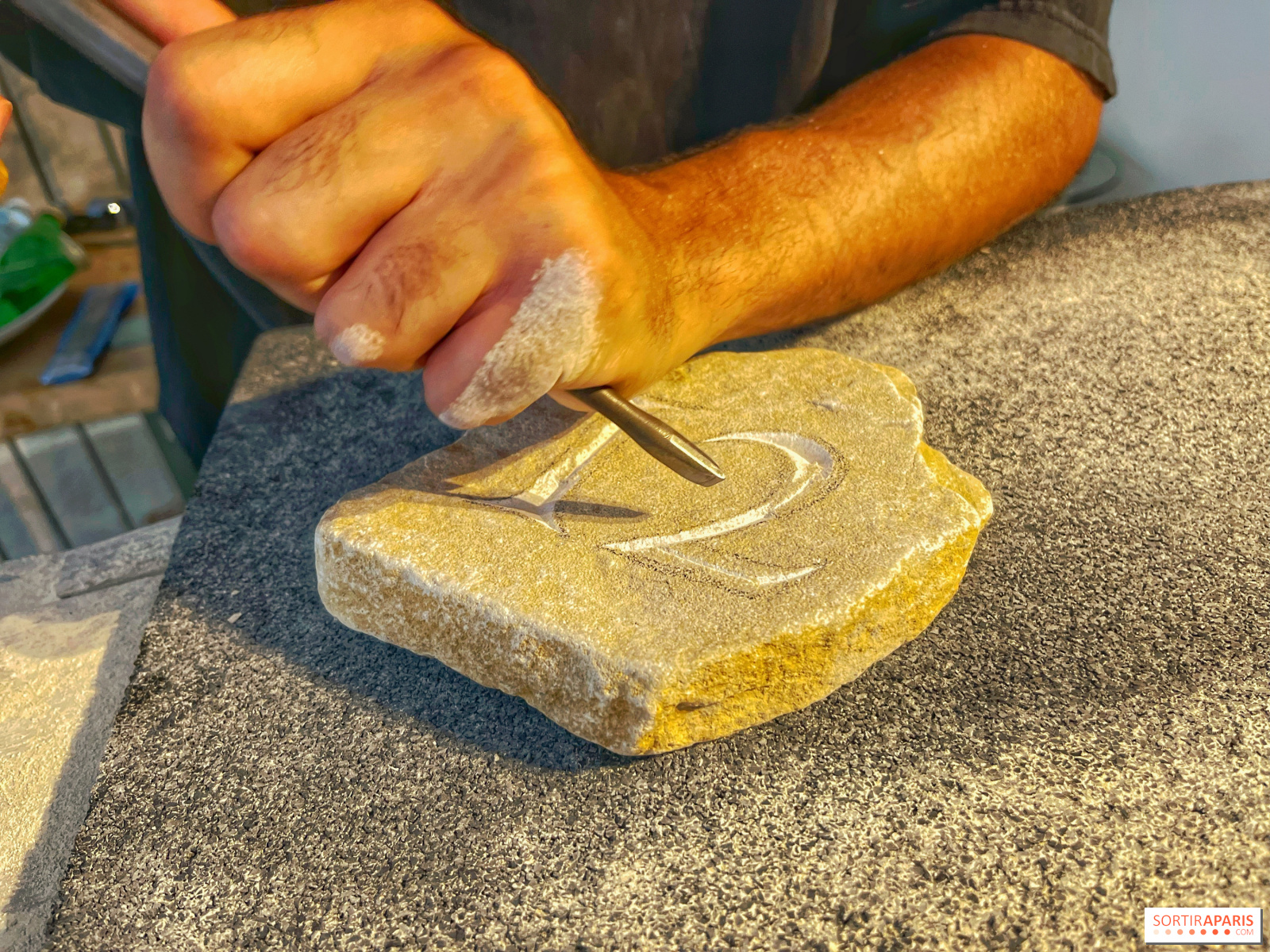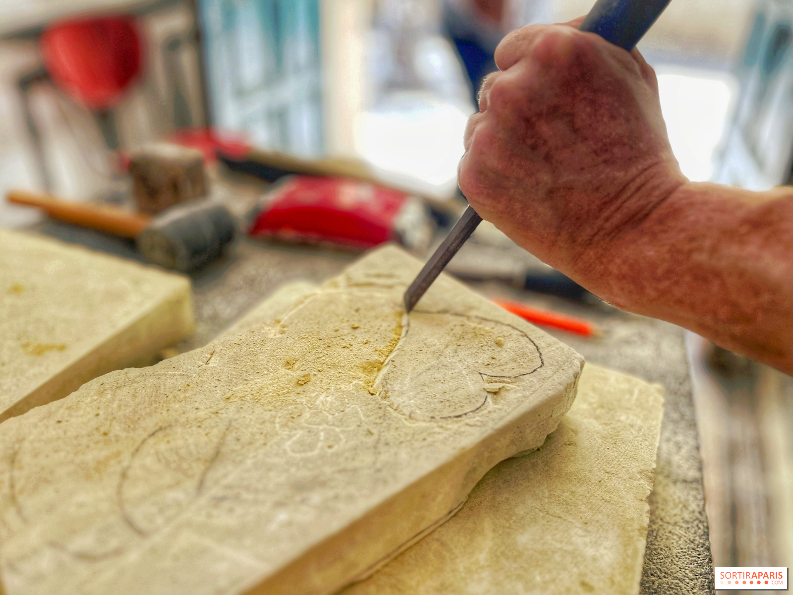 Men du kan naturligtvis ta pauser, särskilt eftersom drycker ingår under hela workshopen. Även om det också finns Lutetian kalksten, den berömda "Parisstenen", är den vi hugger mjukare och kommer från Oise-regionen - från det stenbrott som användes för att restaurera Notre-Dame-katedralen i Paris - vilket gör den lättare att arbeta med.