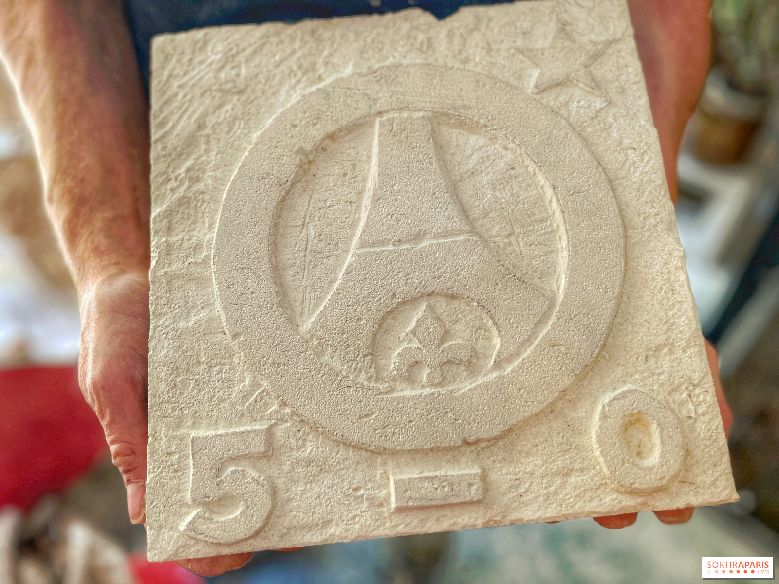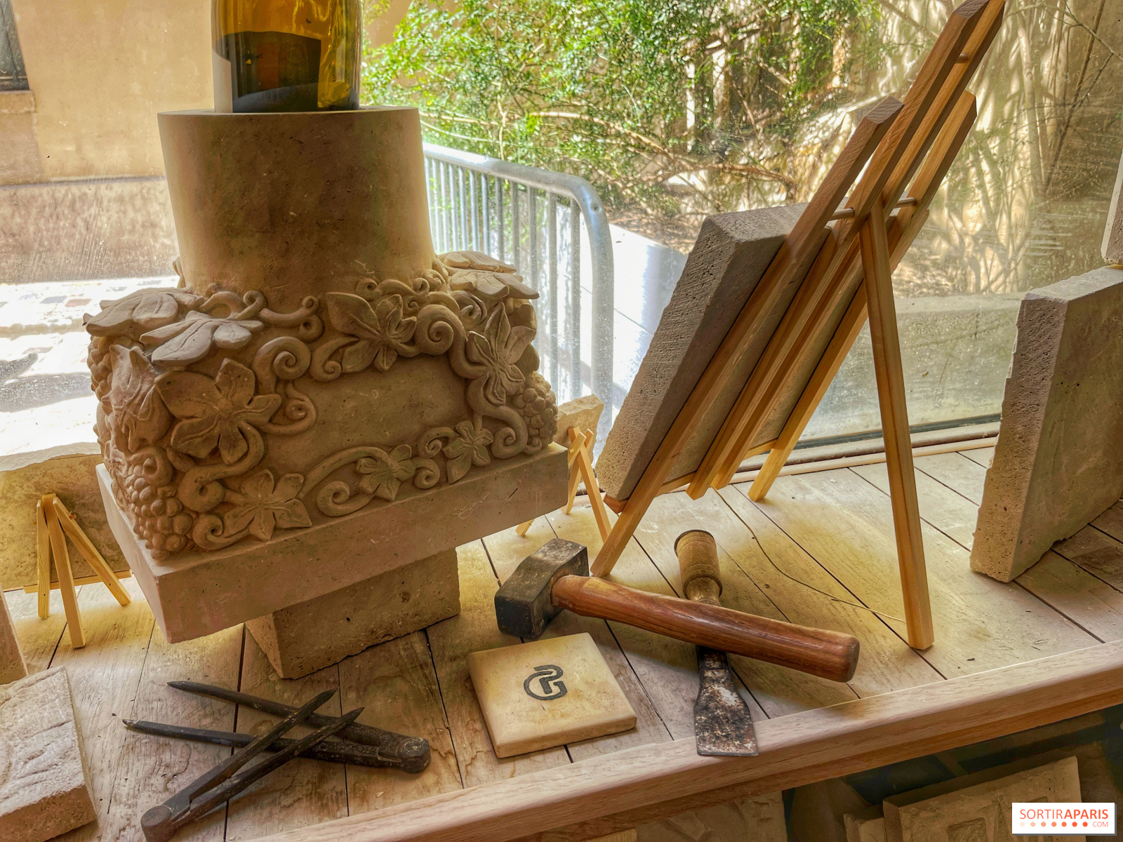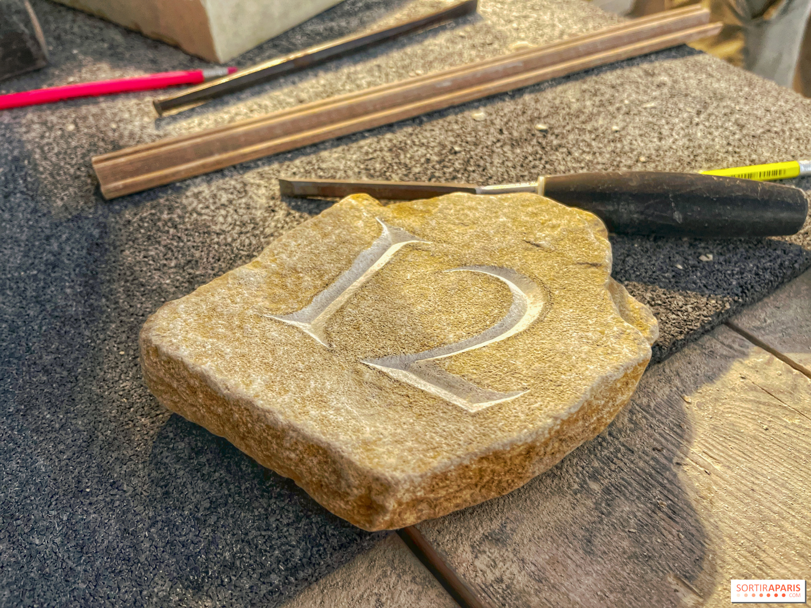 Men du kan naturligtvis ta pauser, särskilt eftersom drycker ingår under hela workshopen. Även om det också finns Lutetian kalksten, den berömda "Parisstenen", är den vi hugger mjukare och kommer från Oise-regionen - från det stenbrott som användes för att restaurera Notre-Dame-katedralen i Paris - vilket gör den lättare att arbeta med.
