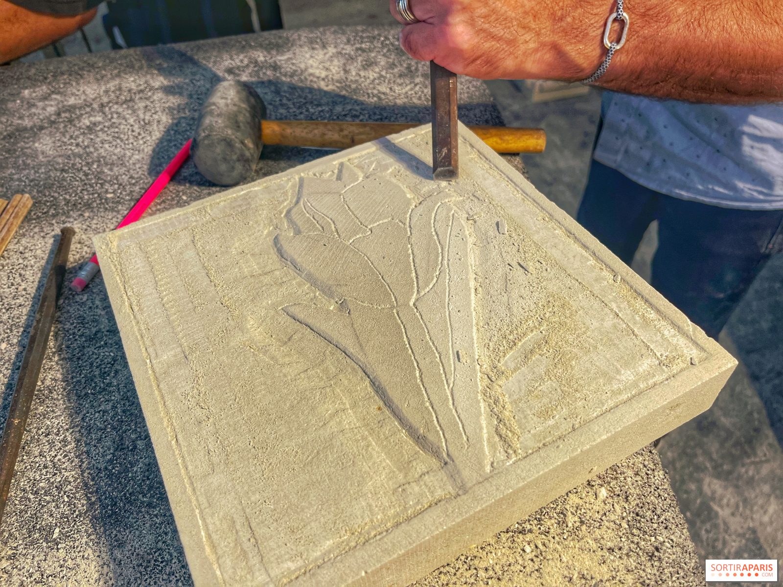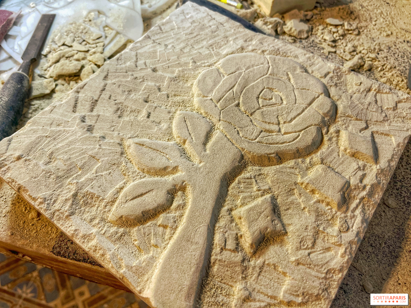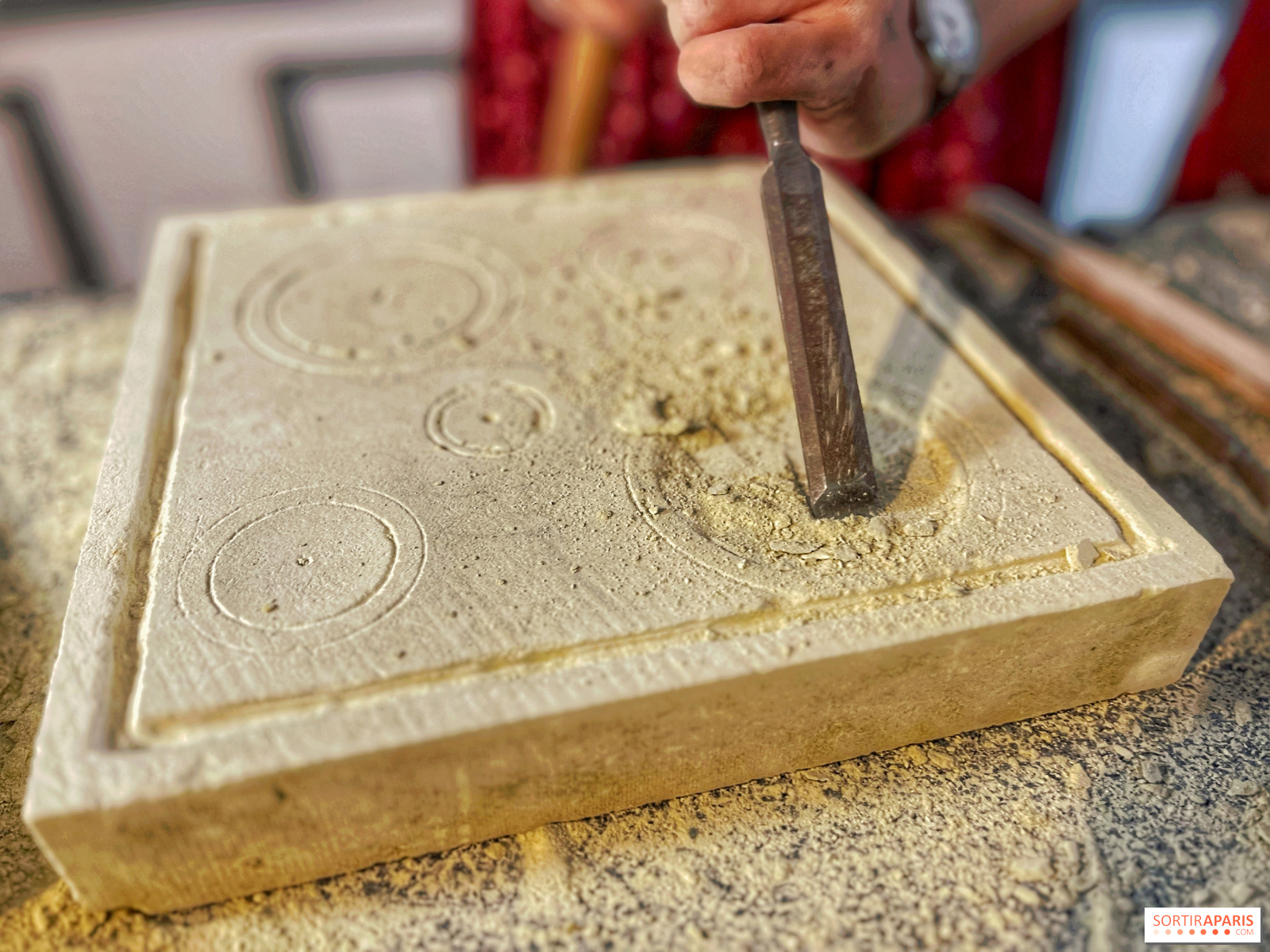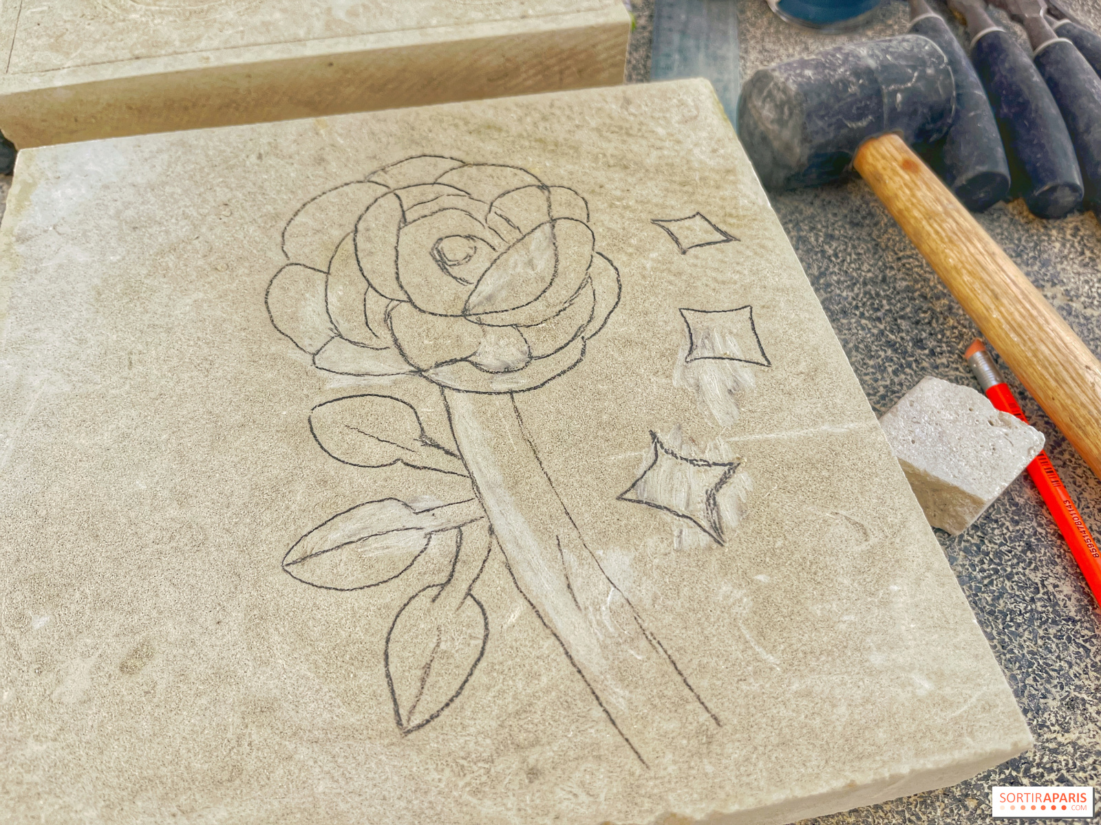 När du anländer till denna vackra historiska verkstad i Marais-distriktet i Paris sätter doften av sten snabbt stämningen. Du sätter dig vid ditt bord, framför din 25×25 cm stora sten och dina verktyg, tillsammans med de andra lärlingarna för dagen, och börjar arbeta med den design du vill skapa.